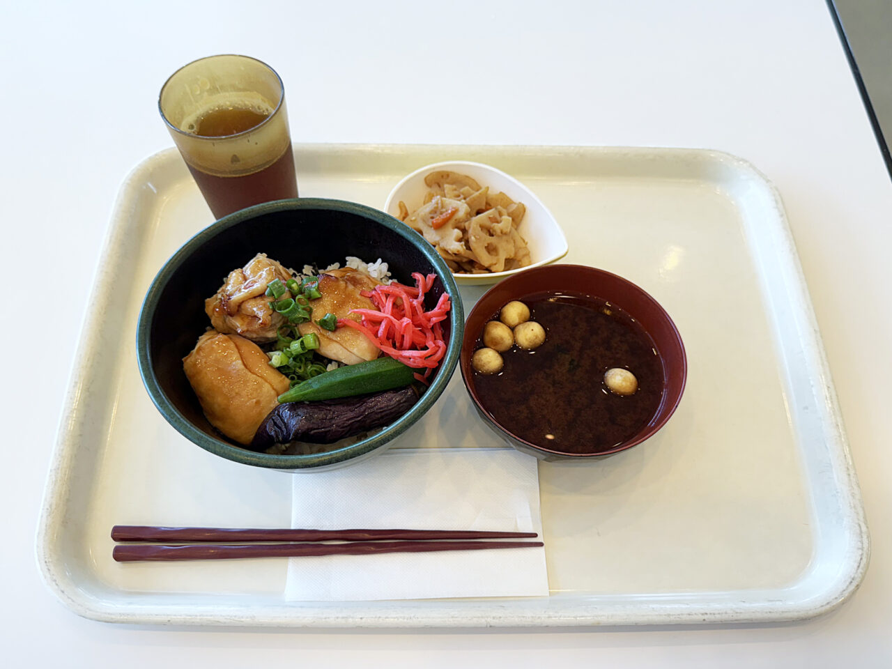 鶏照り焼きとオクラ・ナスの素揚げに紅生姜が添えられており、甘辛のタレが掛かったご飯が美味しいです。