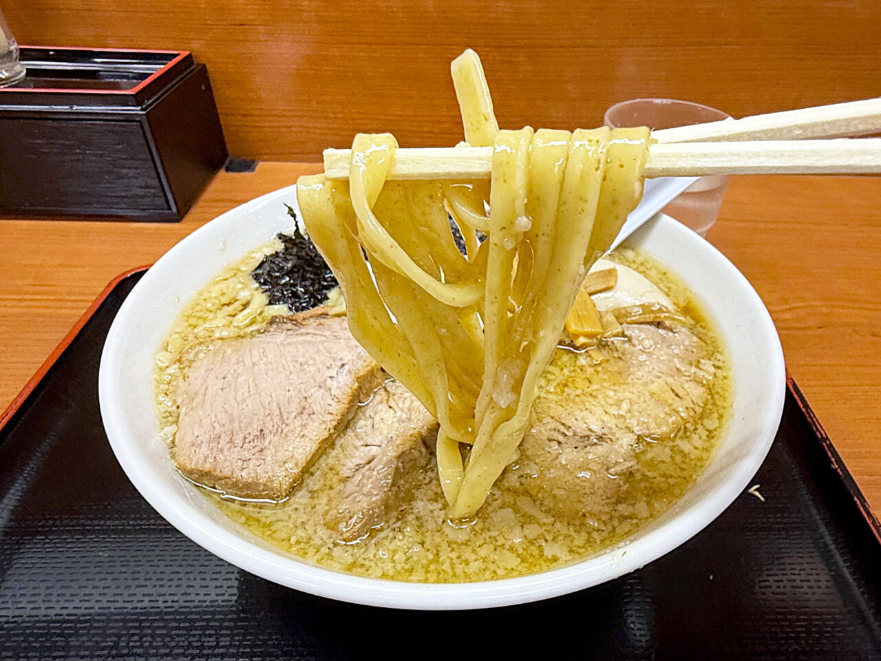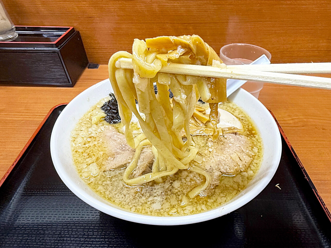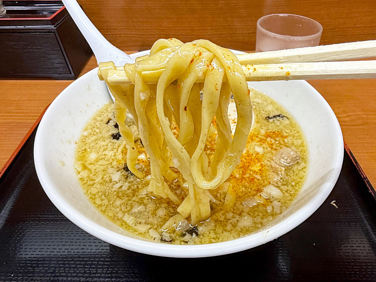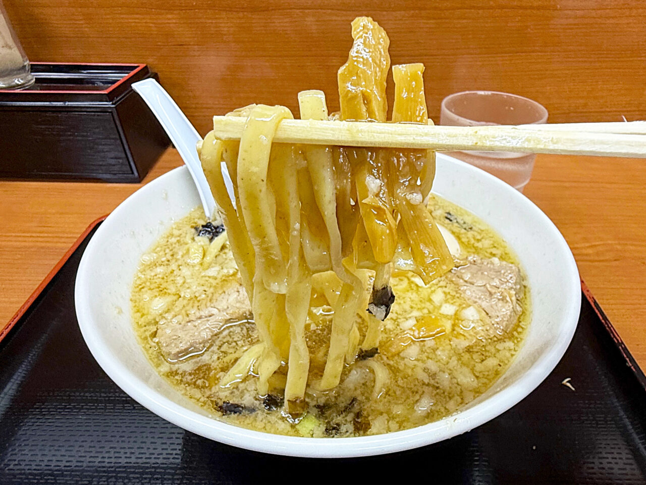 全粒粉入りの平打ち太麺もスープに良く合います。