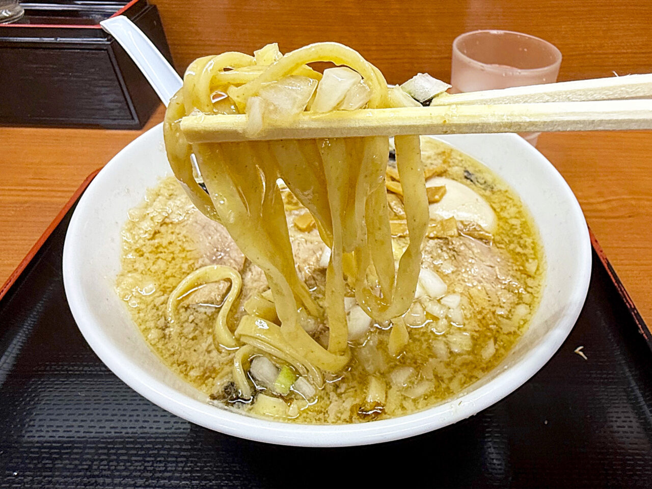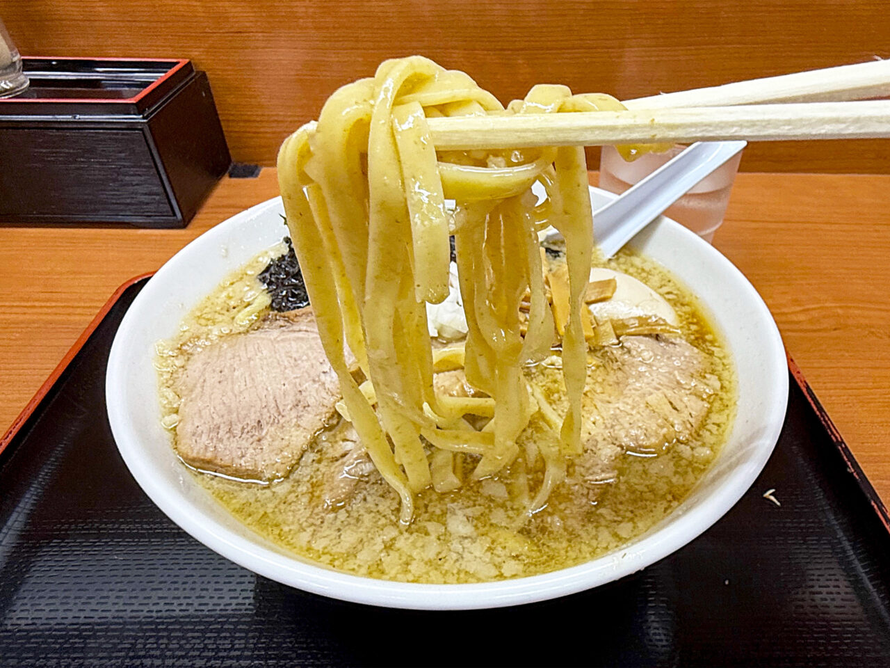 背脂がビッシリと浮いたスープはクドさは無く、豚と魚介の旨みと背脂で甘味とまろやかさを加えています。