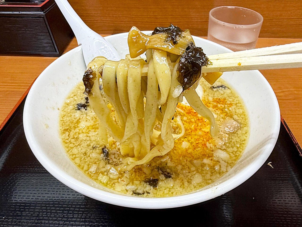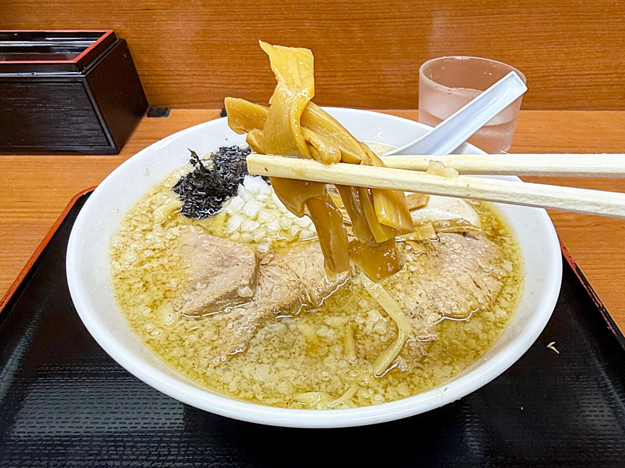 麺とメンマの幅が近いので、口当たりは良く似てますが、噛むと食感の違いが味わえます。