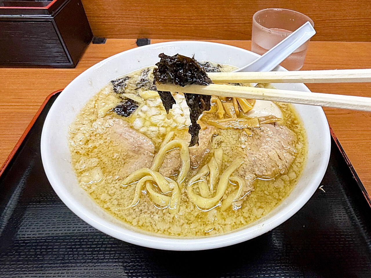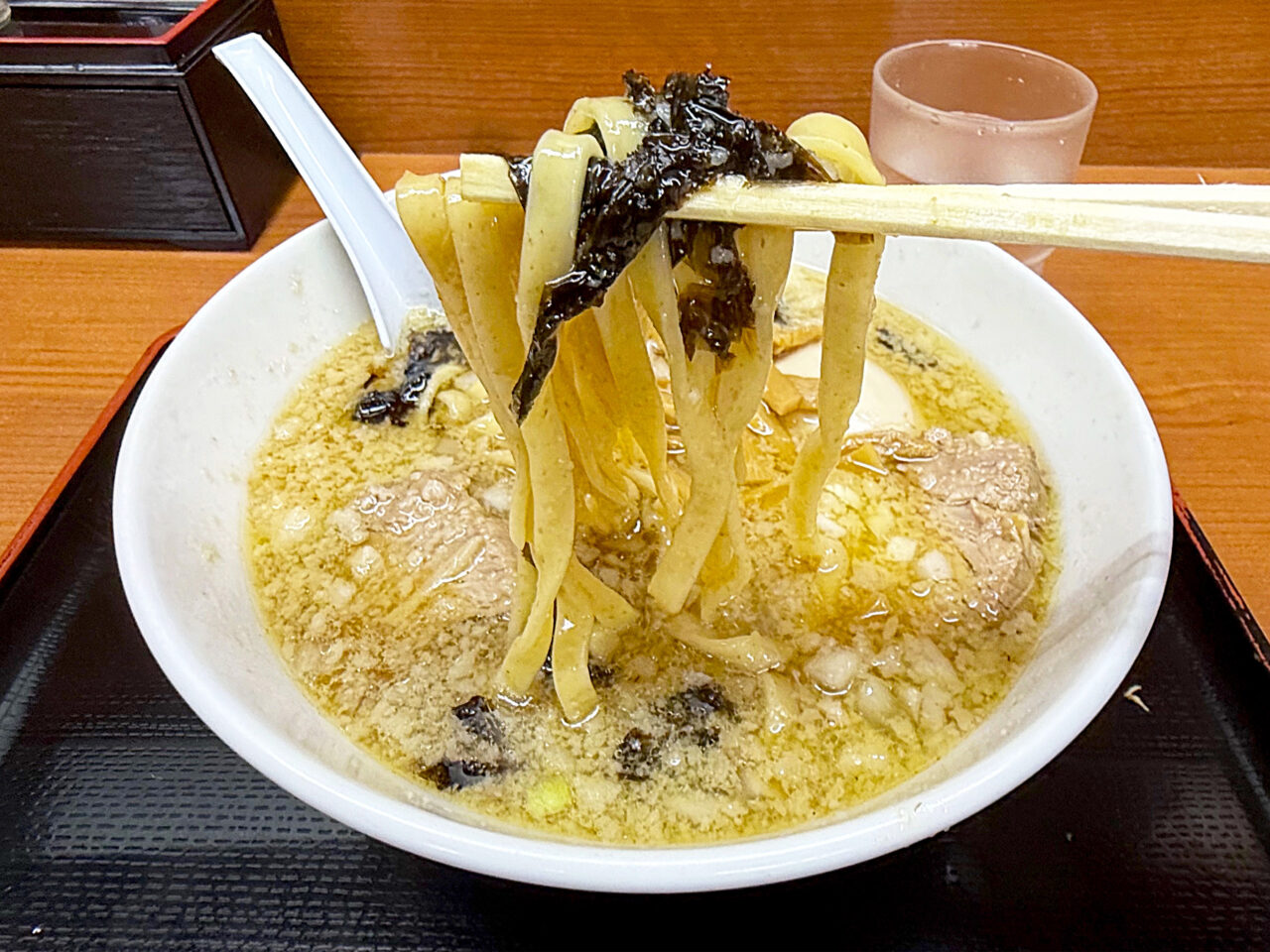 全粒粉入りの麺の風味とバラ海苔の香ばしさが良く合います。