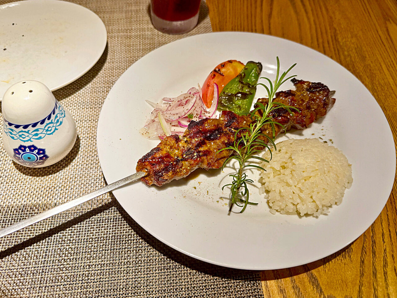ラム肉のシシケバブに、香ばしく焼いた野菜とライスが添えられています。
