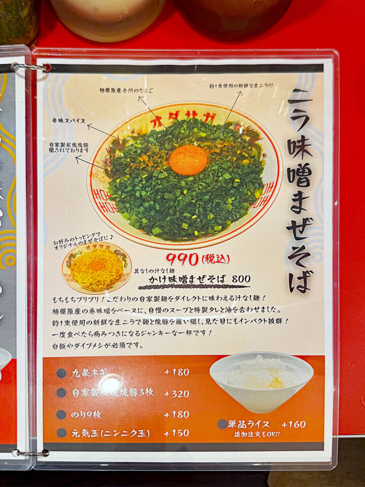 卓上の「ニラ味噌まぜそば」のメニュー。