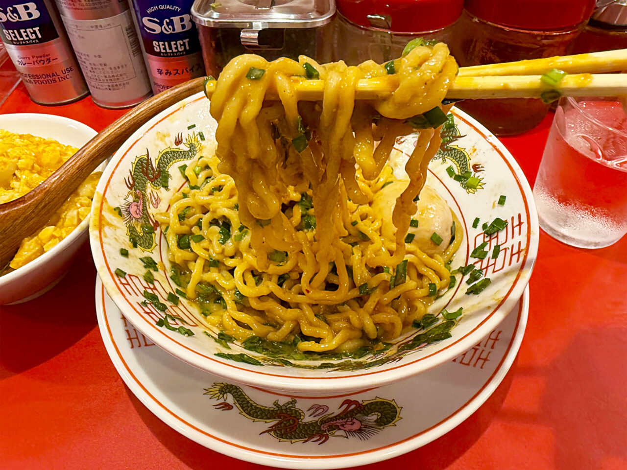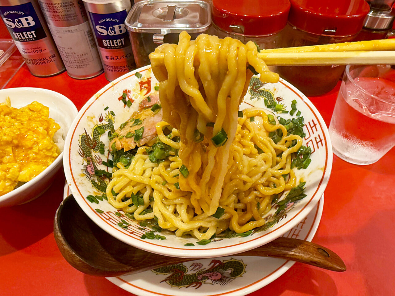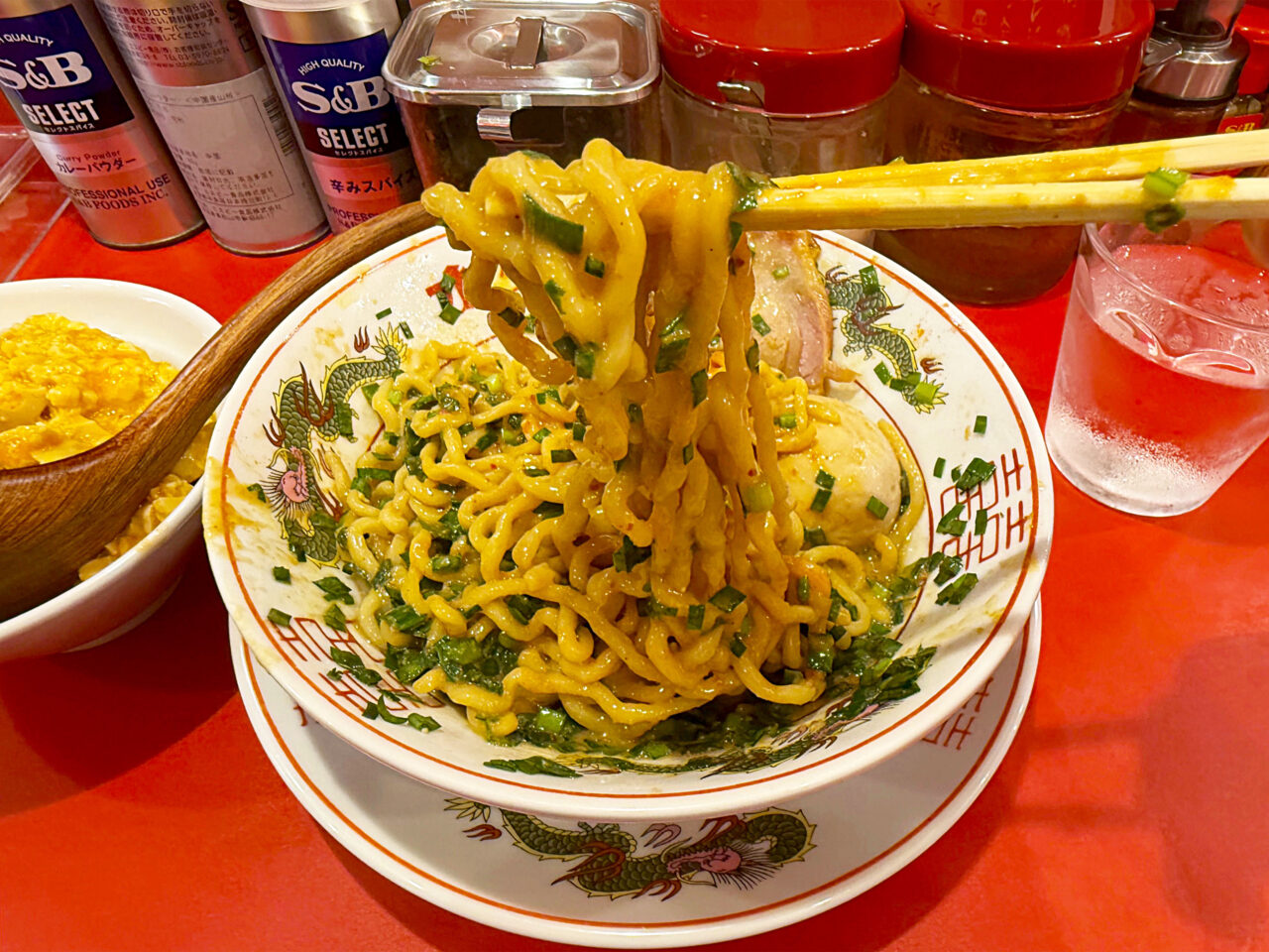 卵黄が麺を包み込む様にコーティングするお陰か、混ぜずに麺とタレを食べるよりもずっとマイルドになります。