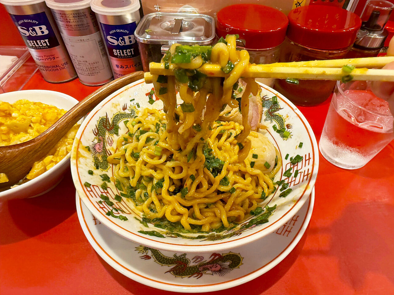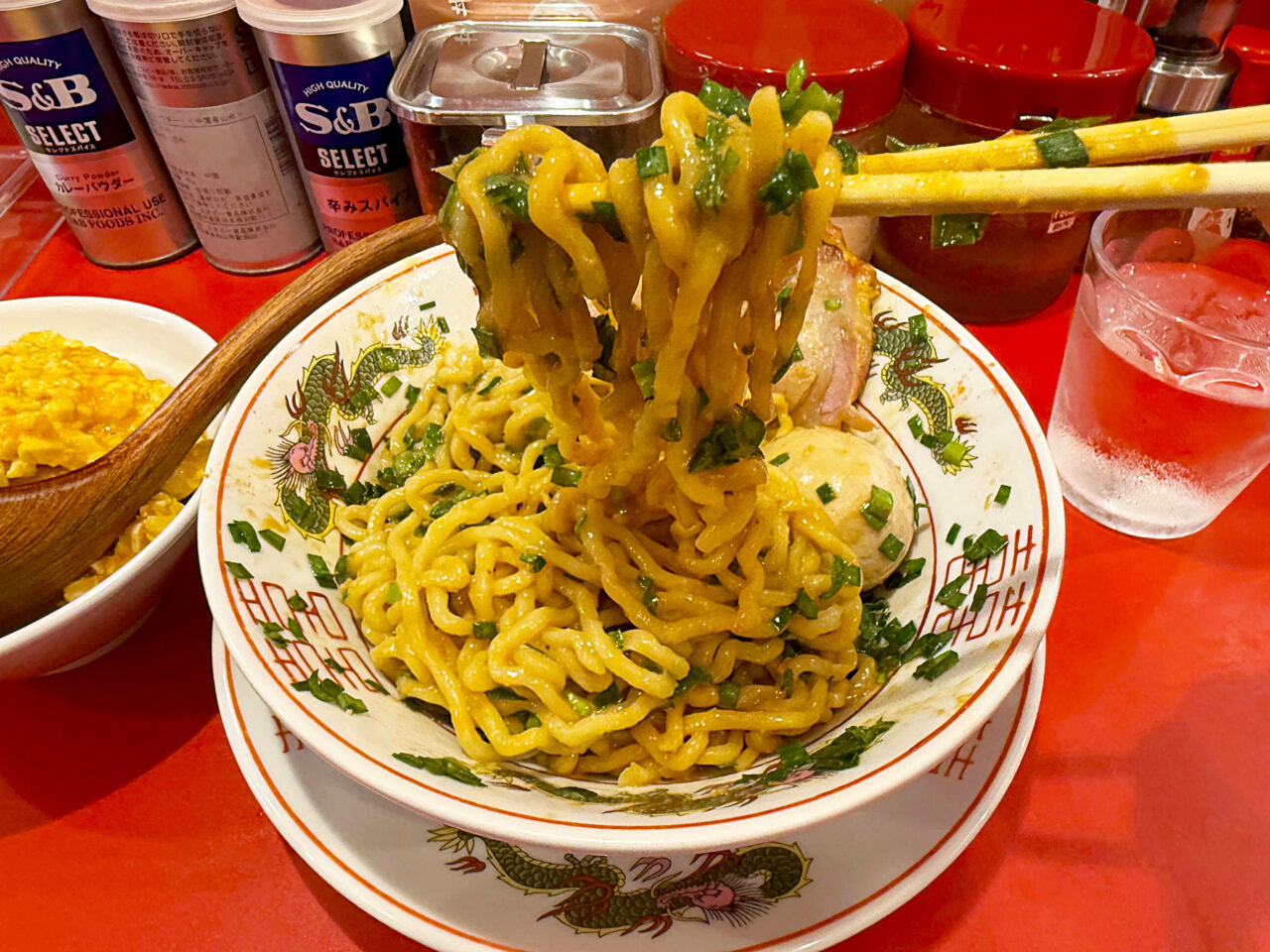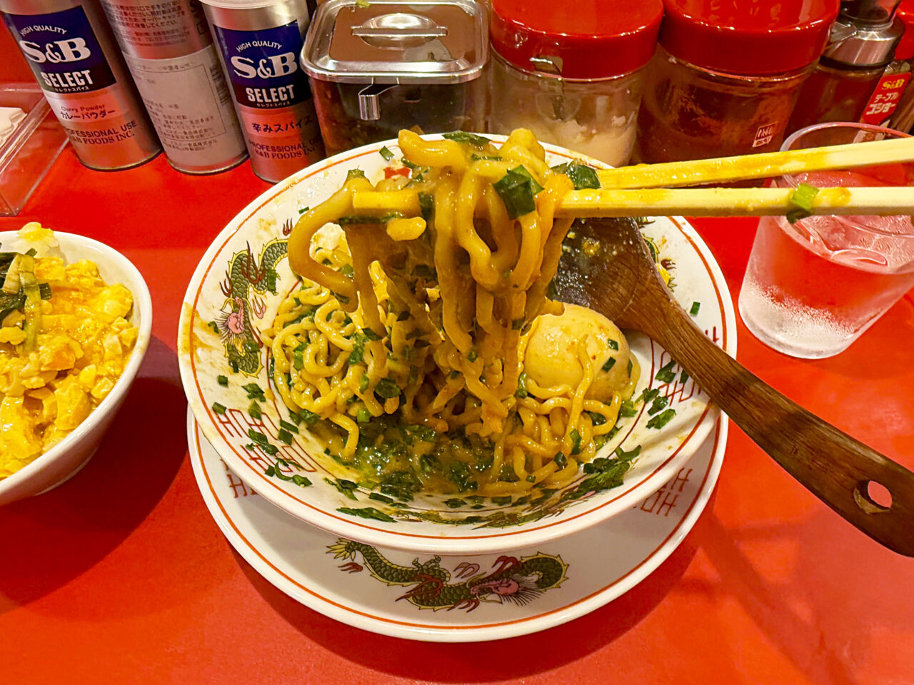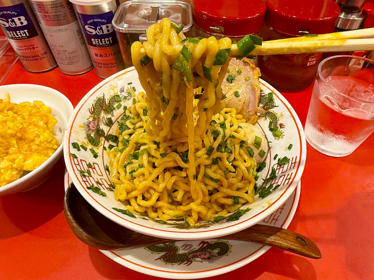 卵黄が麺を包み込む様にコーティングするお陰か、混ぜずに麺とタレを食べるよりもずっとマイルドになります。