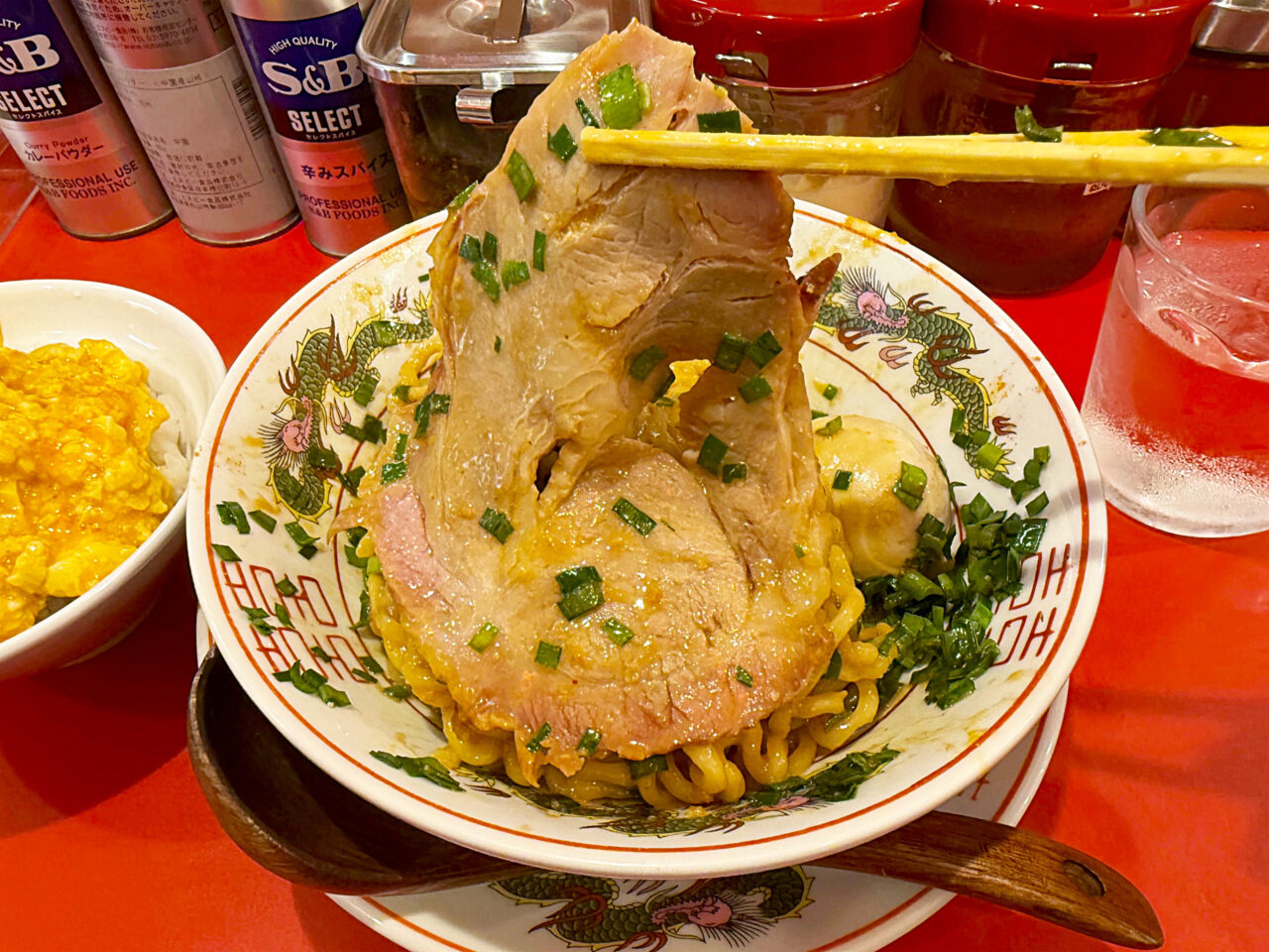 大きな「自家製炭火焼き焼豚」も香ばしく焼き上がっていて、とても大きくて満足度も高いです。