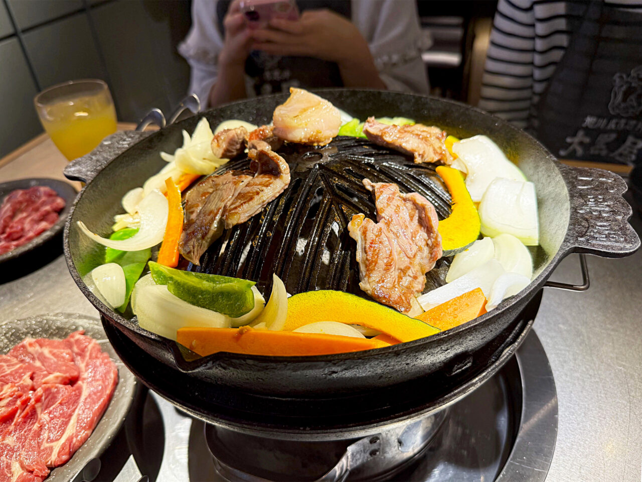 牛脂を引いてから野菜を周囲に置いて、中央で生ラムを焼いて行きます。