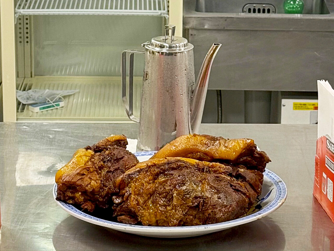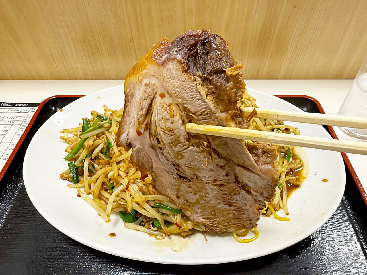 ラーメン二郎の「ブタ」おも凌ぐ巨大さで、甘めのタレがアクセントです。