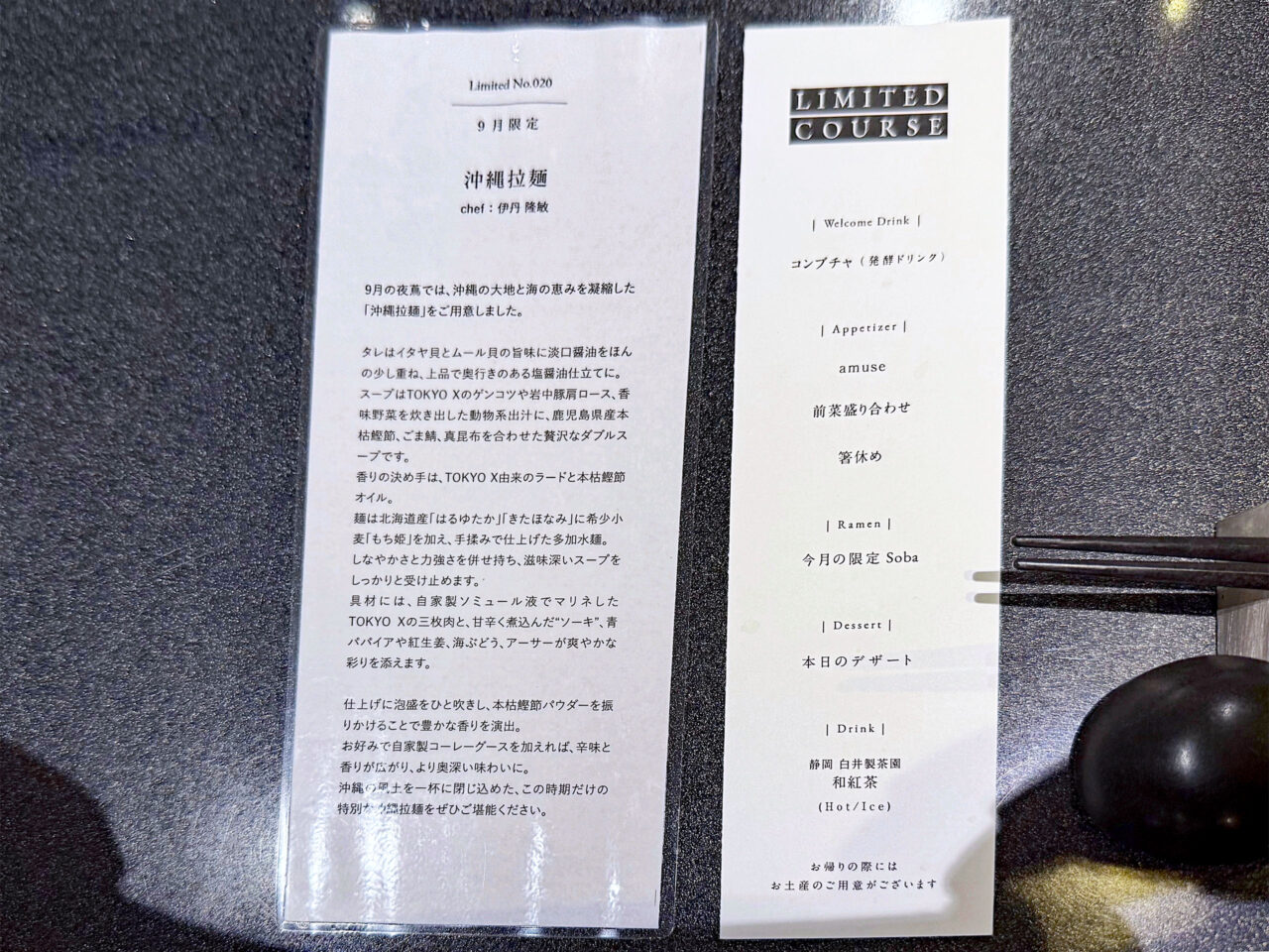 9月の限定ラーメン 「沖縄拉麺」の説明とLimited Courseのメニュー。
