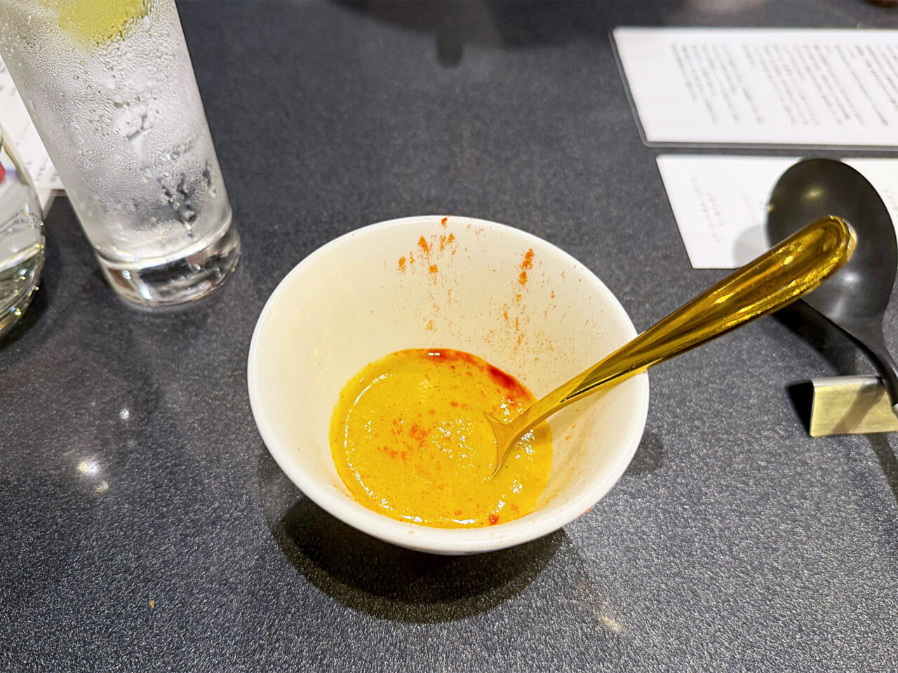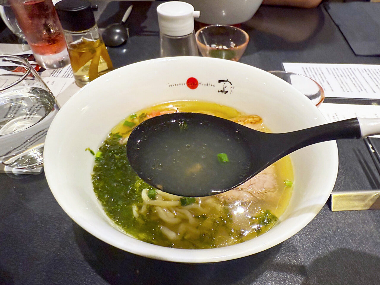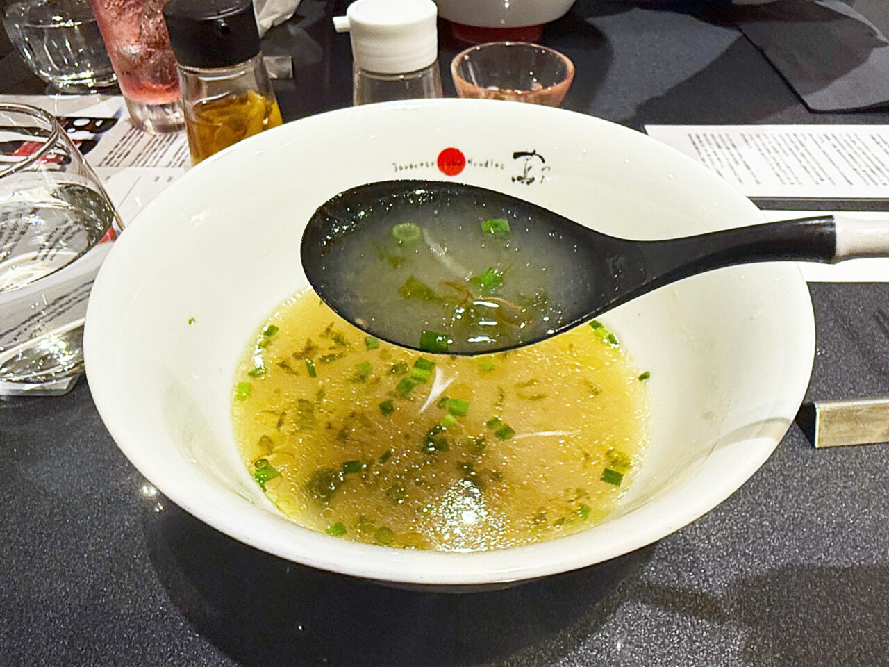 麺と具を食べ終えて、スープを味わいます。