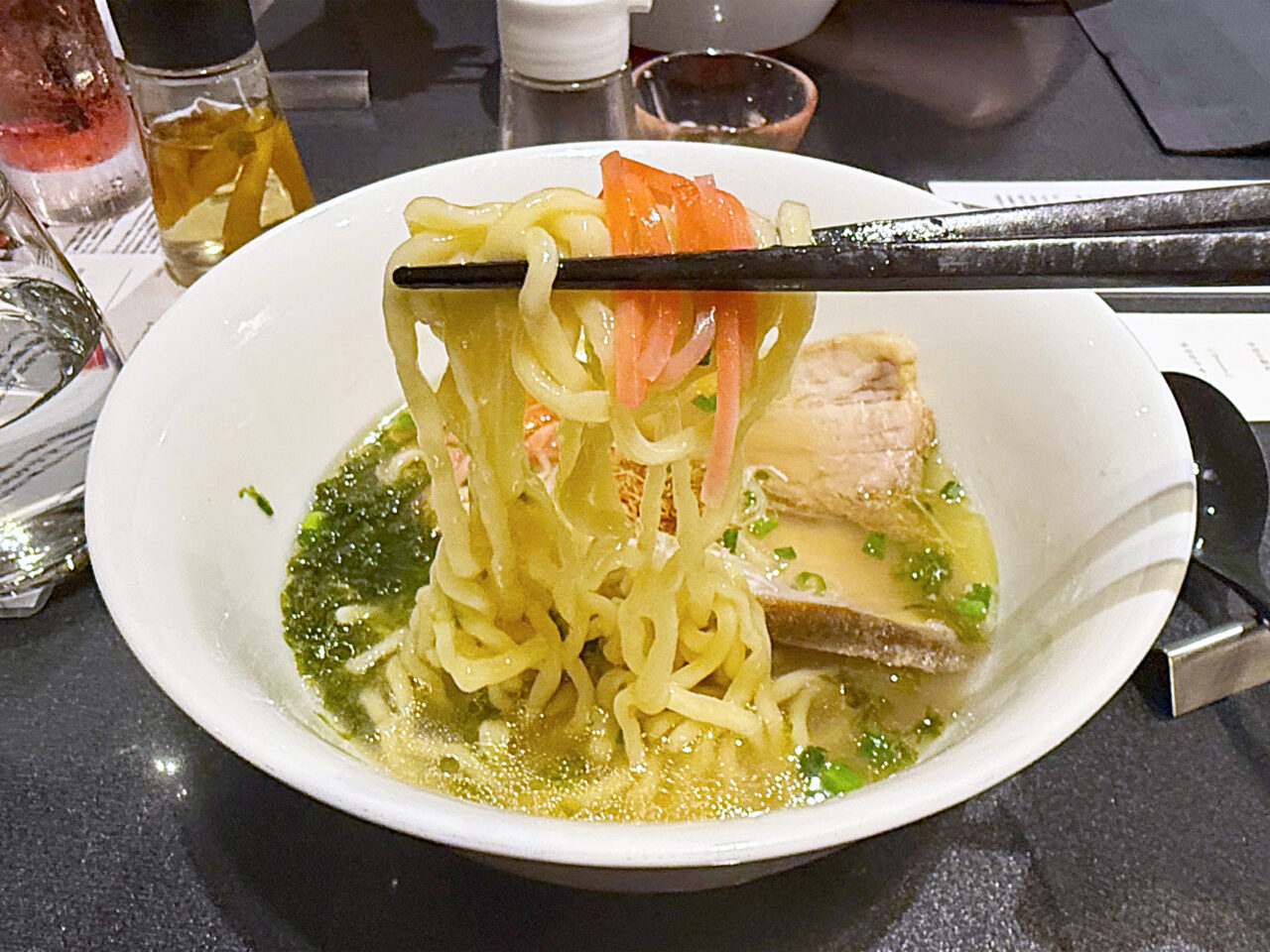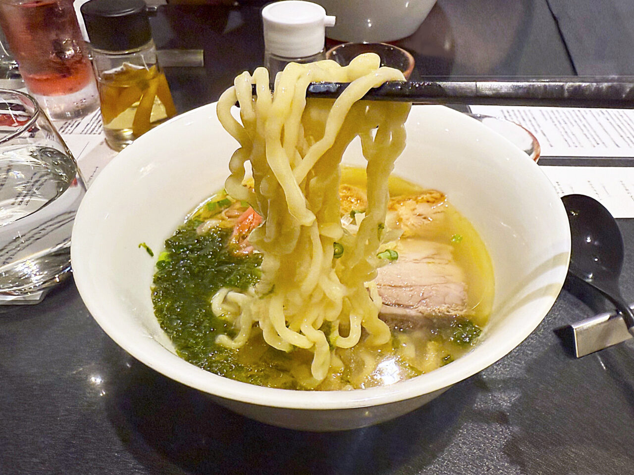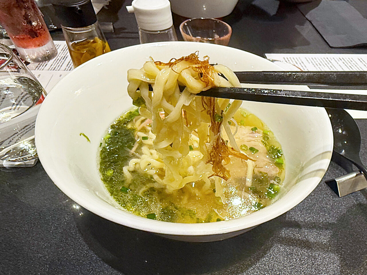 イタヤ貝とムール貝の旨味に淡口醤油をほんの少し重ねた塩醤油仕立てのタレ、香味油はTOKYO X由来のラードと本枯鰹節オイルを合わせたスープは、「沖縄そば」っぽさが有りながら、蔦らしい貝出汁の旨みも有ります。