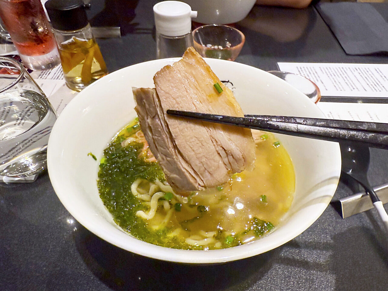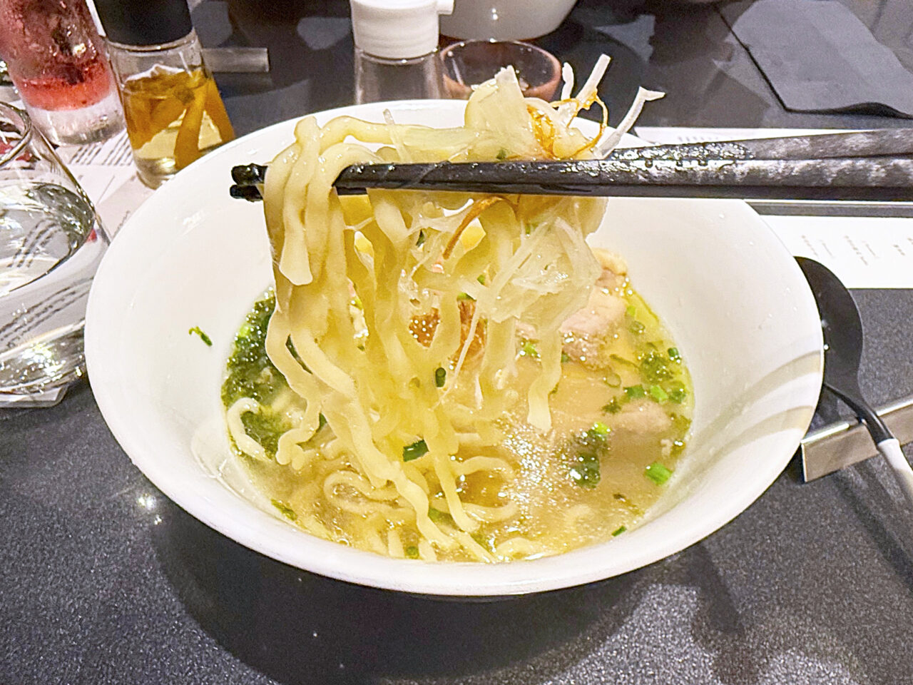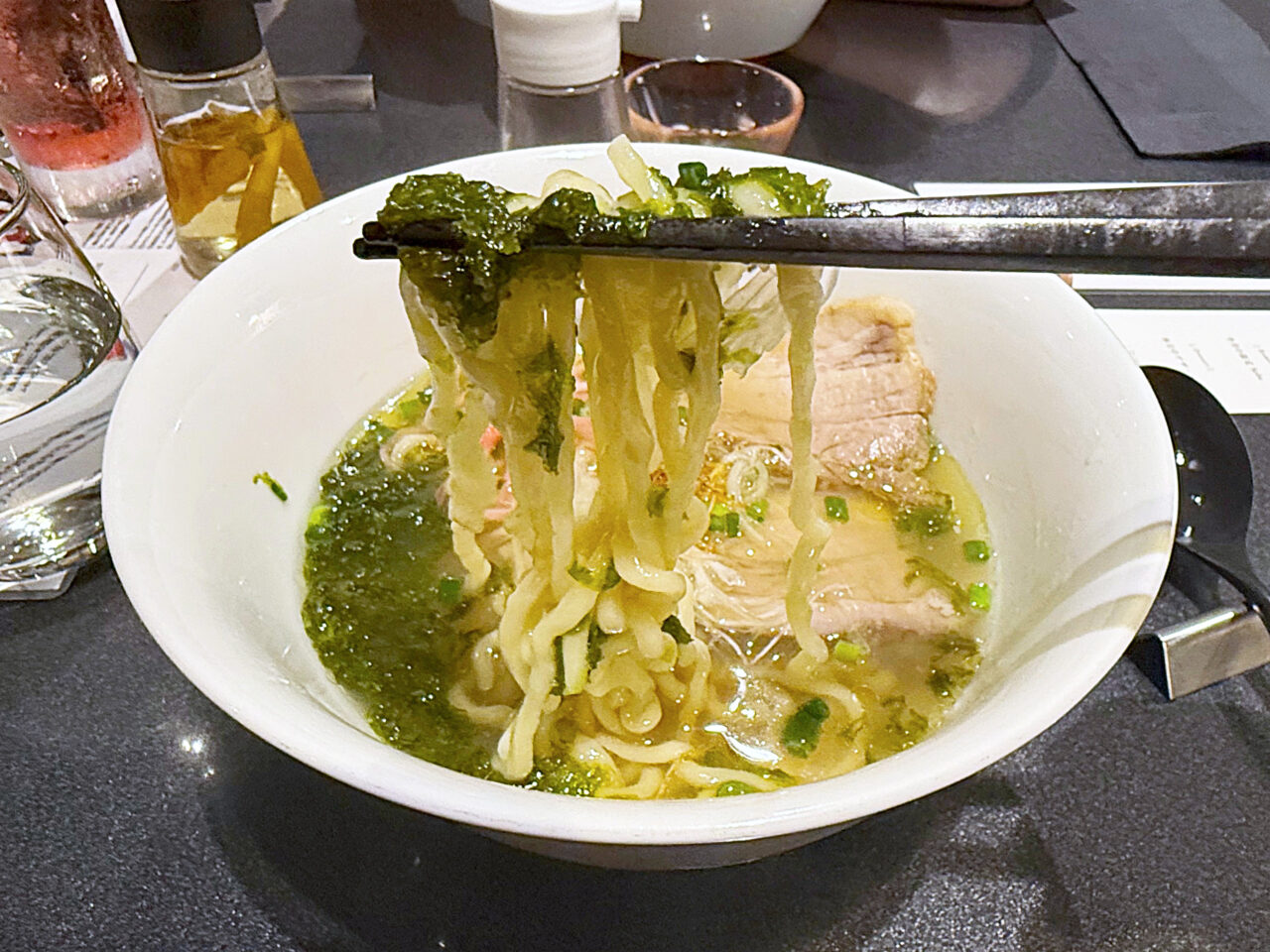 イタヤ貝とムール貝の旨味に淡口醤油をほんの少し重ねた塩醤油仕立てのタレ、香味油はTOKYO X由来のラードと本枯鰹節オイルを合わせたスープは、「沖縄そば」っぽさが有りながら、蔦らしい貝出汁の旨みも有ります。