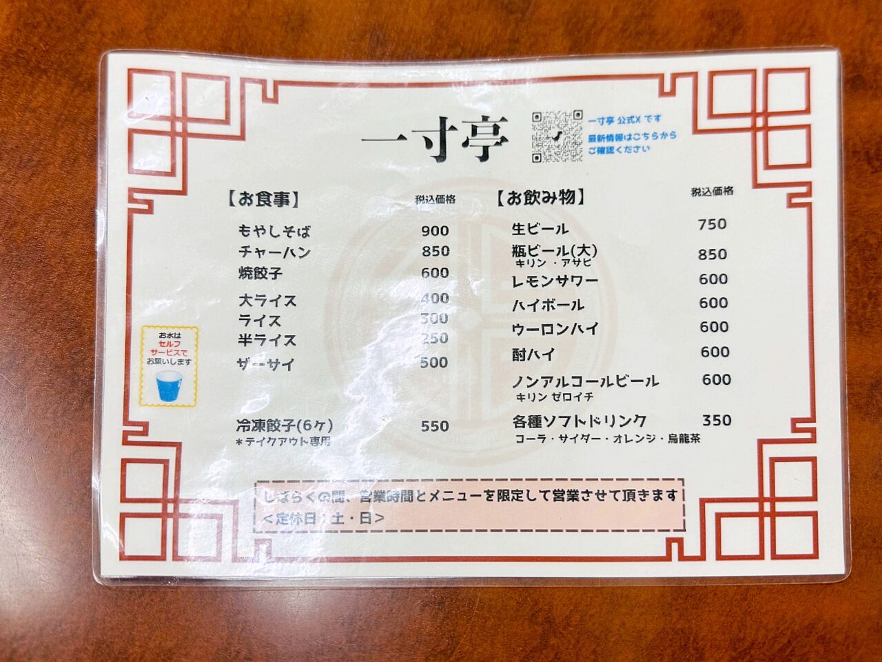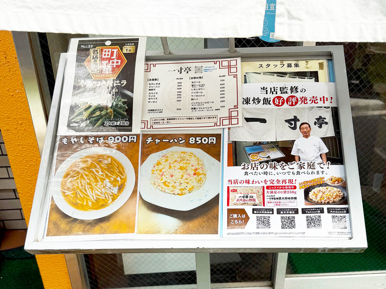 料理のメニューは「もやしそば」、「チャーハン」、「焼餃子」の3つ。