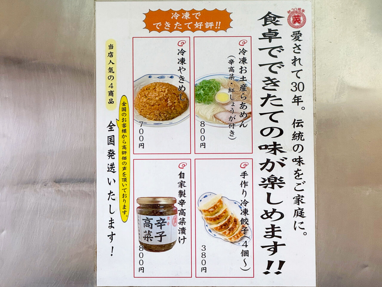 お土産ラーメンや冷凍やきめし、冷凍餃子、自家製辛子高菜などの販売も行っている様です。