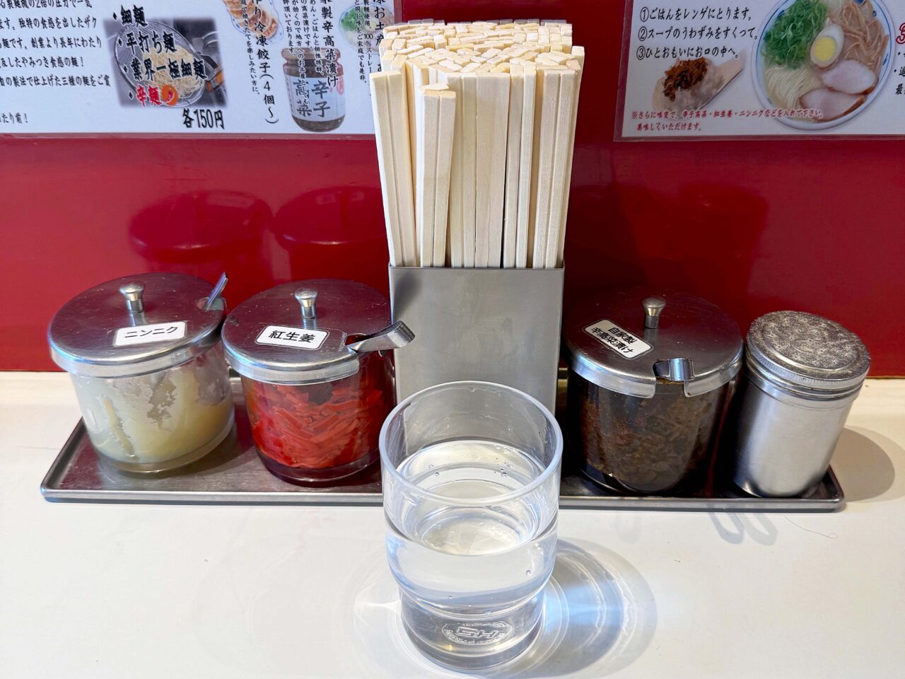 おろしニンニク、紅生姜、箸を挟んで自家製辛子高菜、ホワイトペッパーです。