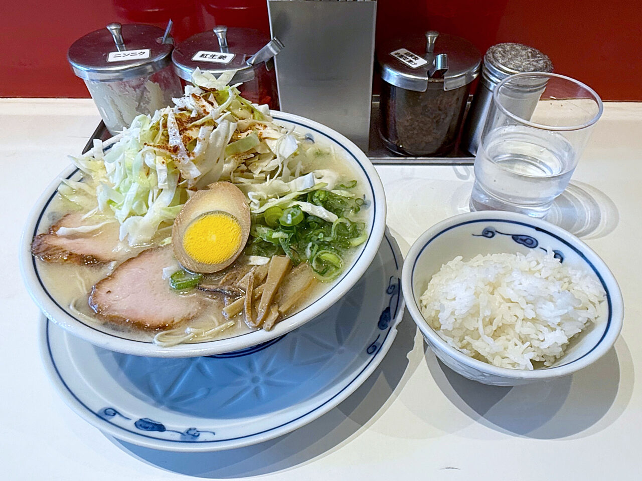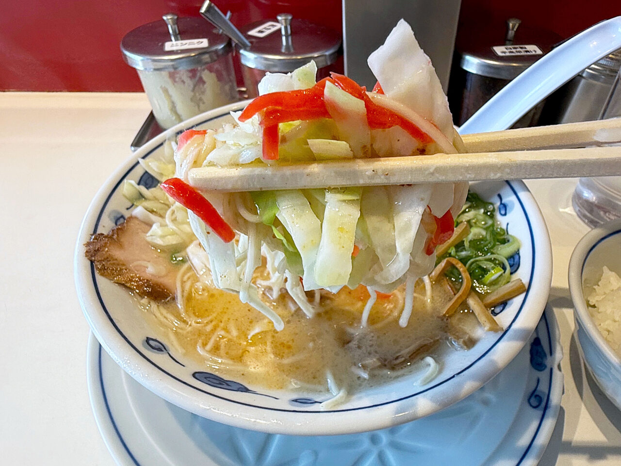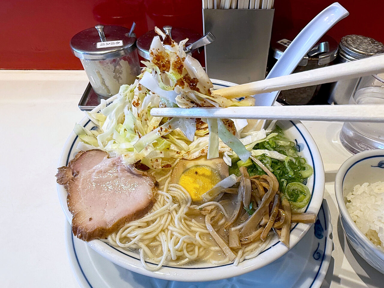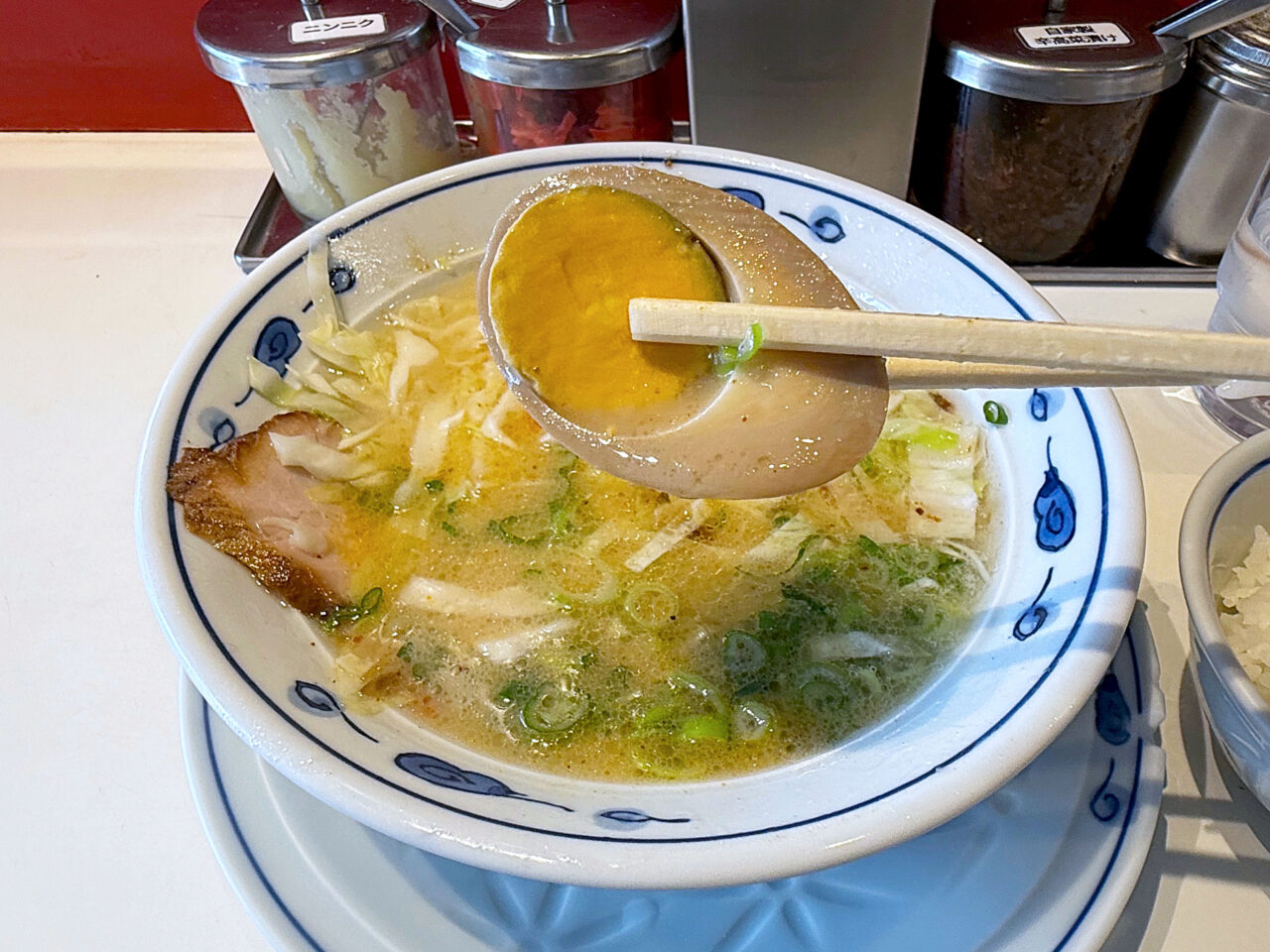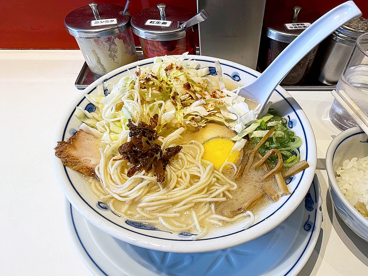 アッサリ系のとんこつスープにザクザク食感の細麺、そしてキャベツとマー油は熊本ラーメンを彷彿とさせます。