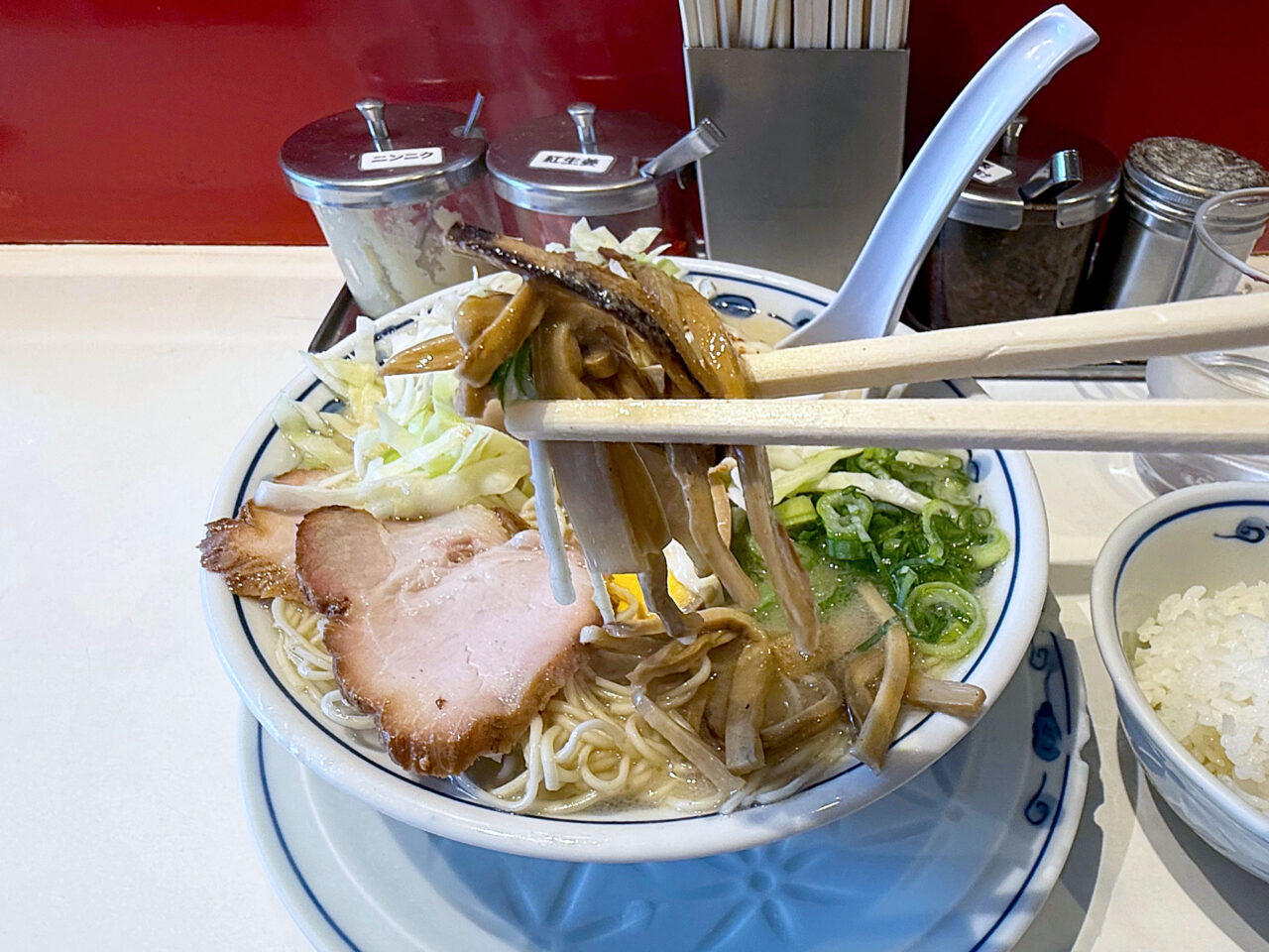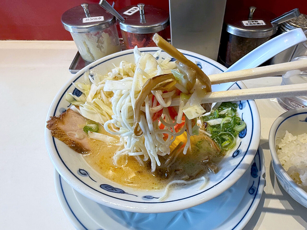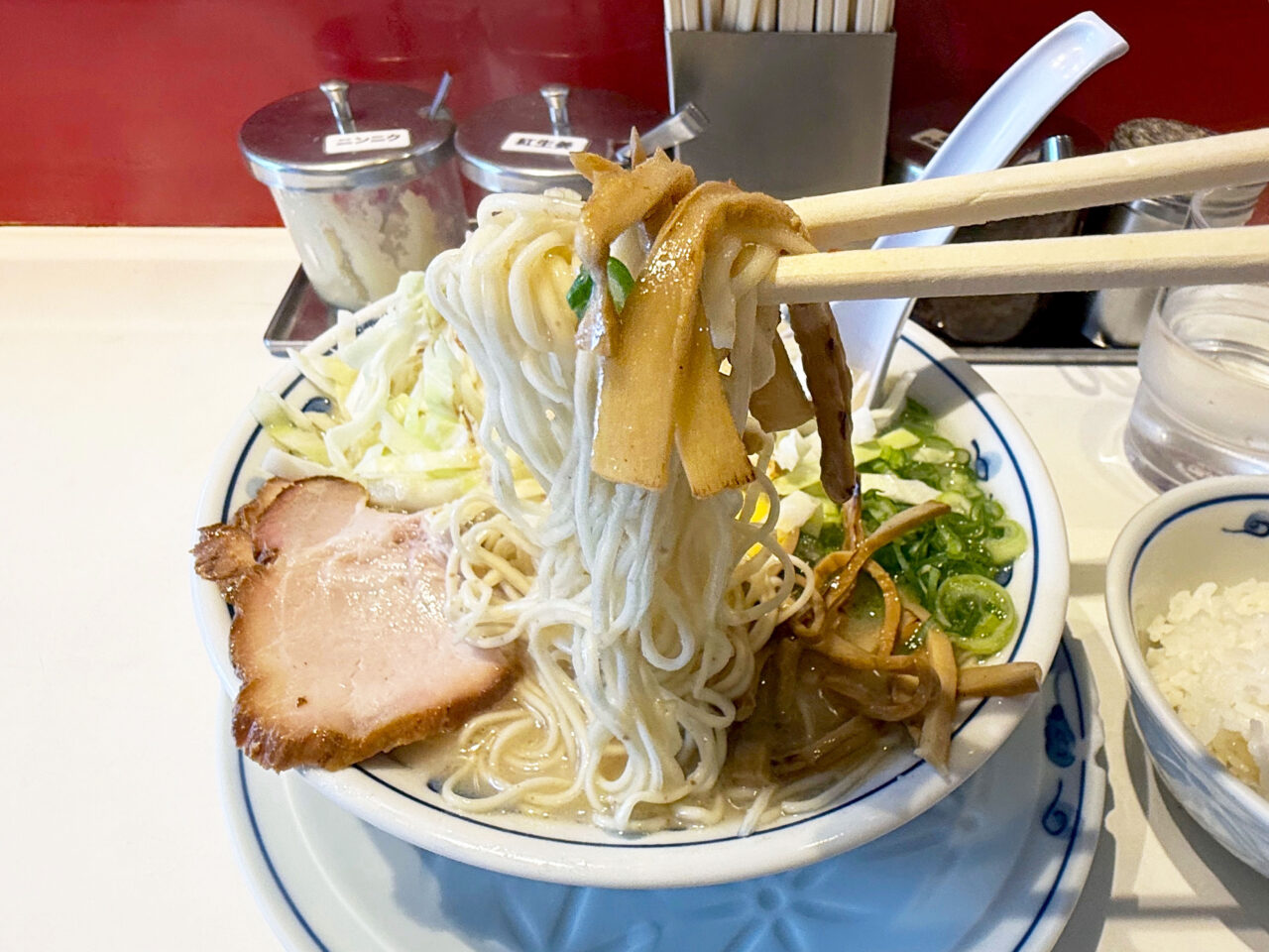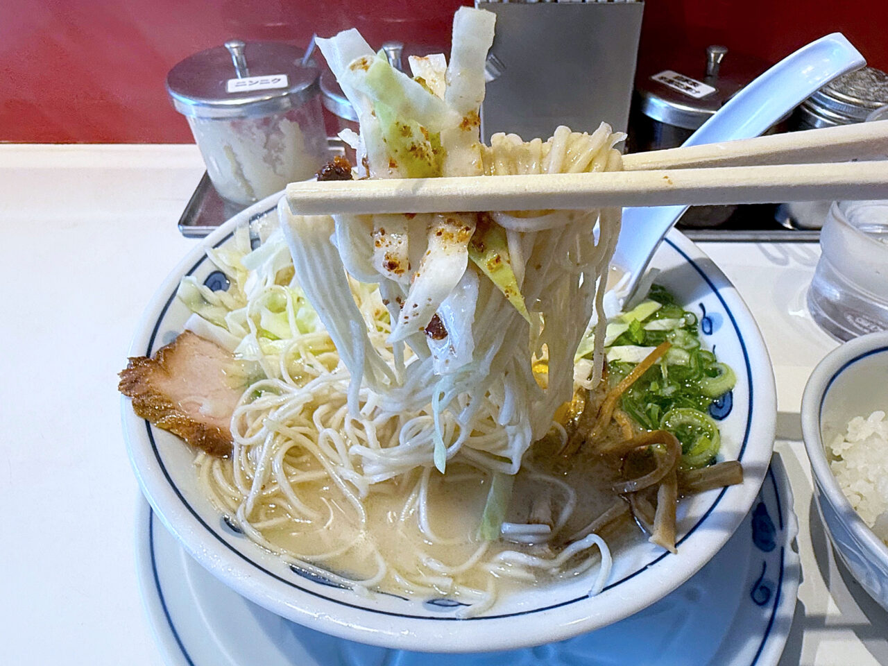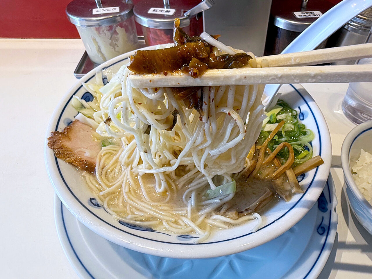 ザクザク食感の麺はスープが適度に絡み、生姜の風味と相まって至福の旨さです。