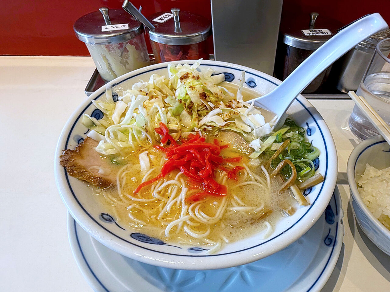 とんこつラーメンに紅生姜は鉄板の組み合わせ。