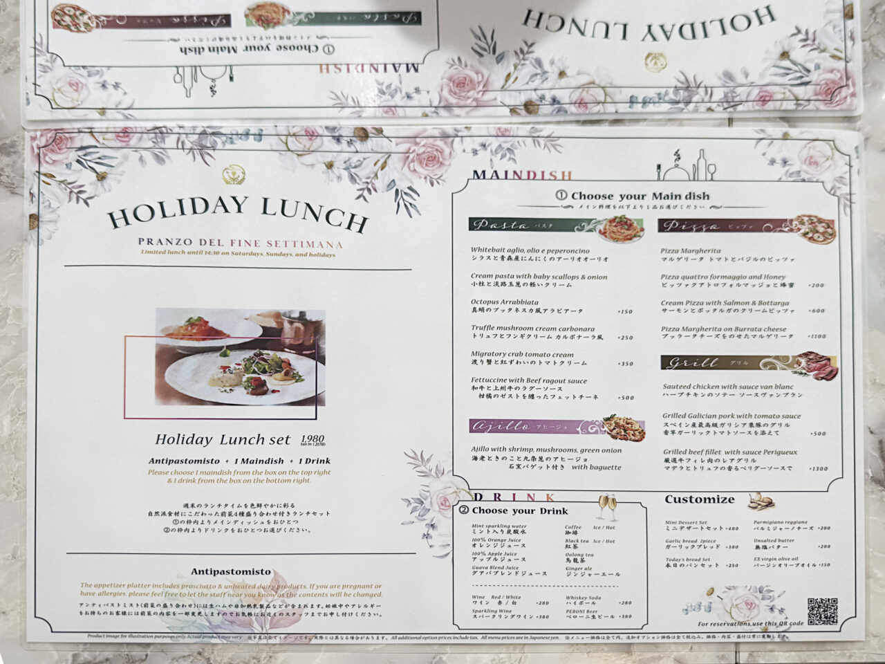 「前菜盛り合わせ」、「サラダ」、「パン」+ドリンク付きで、選べる4種のメインで様々な組み合わせが可能です。
