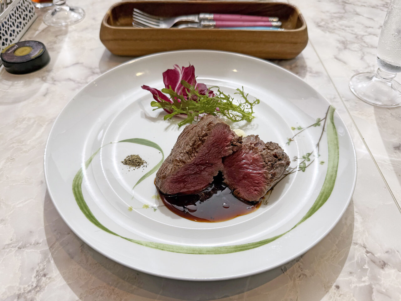 「Grilled beef fillet with sauce Perigueux」(厳選牛フィレ肉のレアグリル マデラとトリュフの香るベリグーソース)はマデラ酒とトリュフのソースがとても美味しくて、とても柔らかいフィレ肉を美味しくいただけます。
