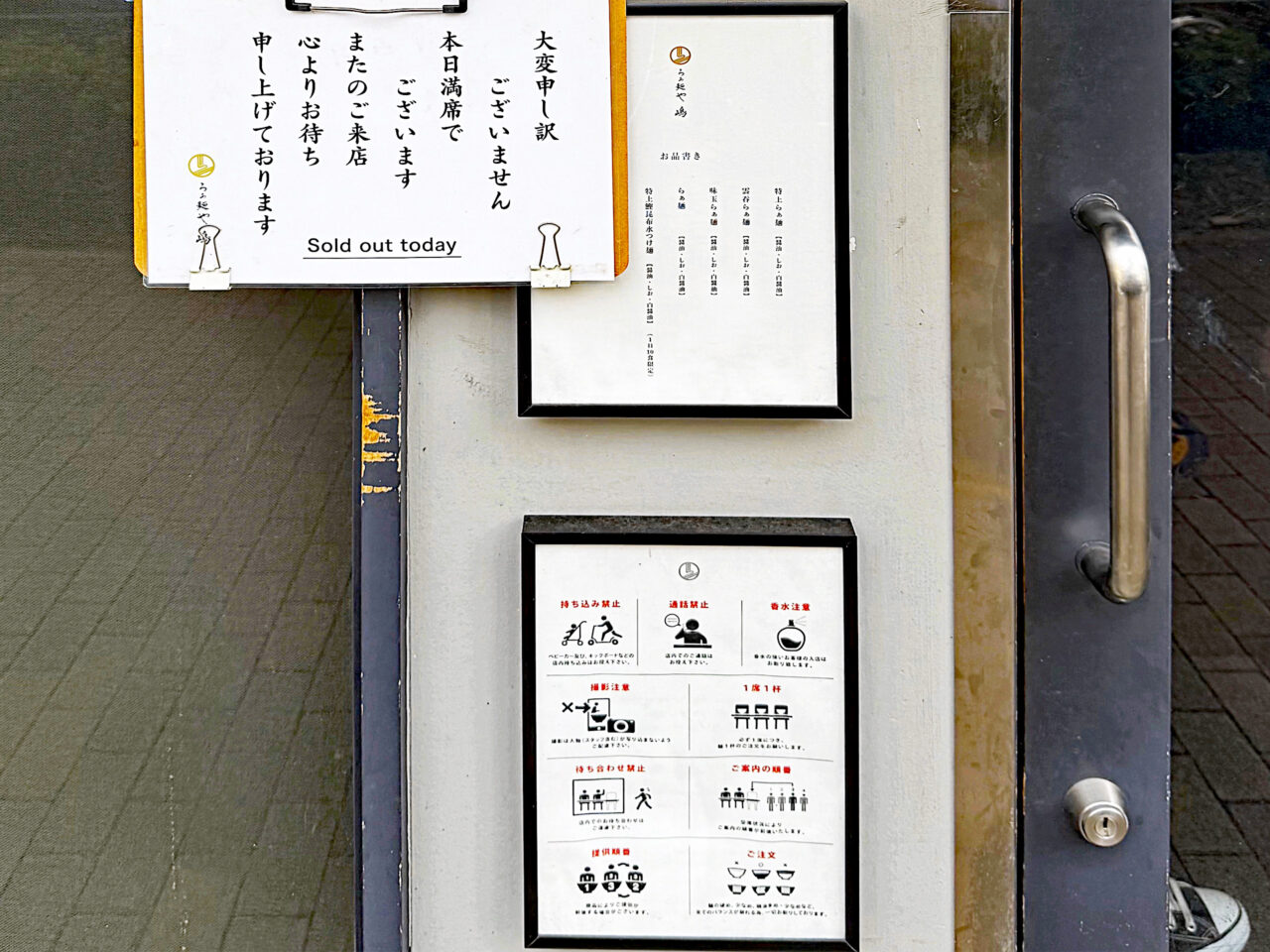 1人1杯注文必須、店内待ち合わせ禁止、順番が前後するケースの説明、麺多め・少なめ、油多め・少なめなどの調整不可などが書かれています。
