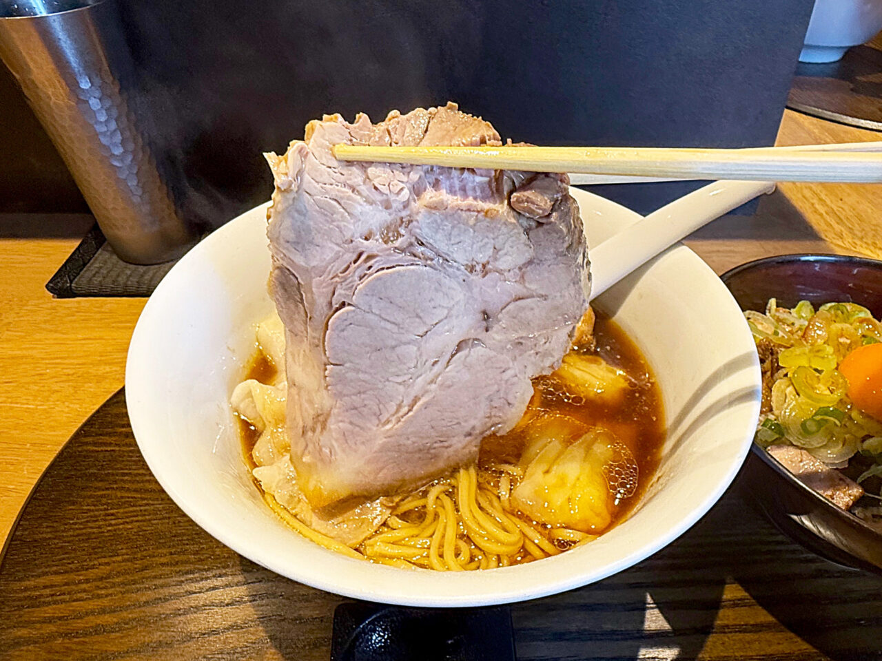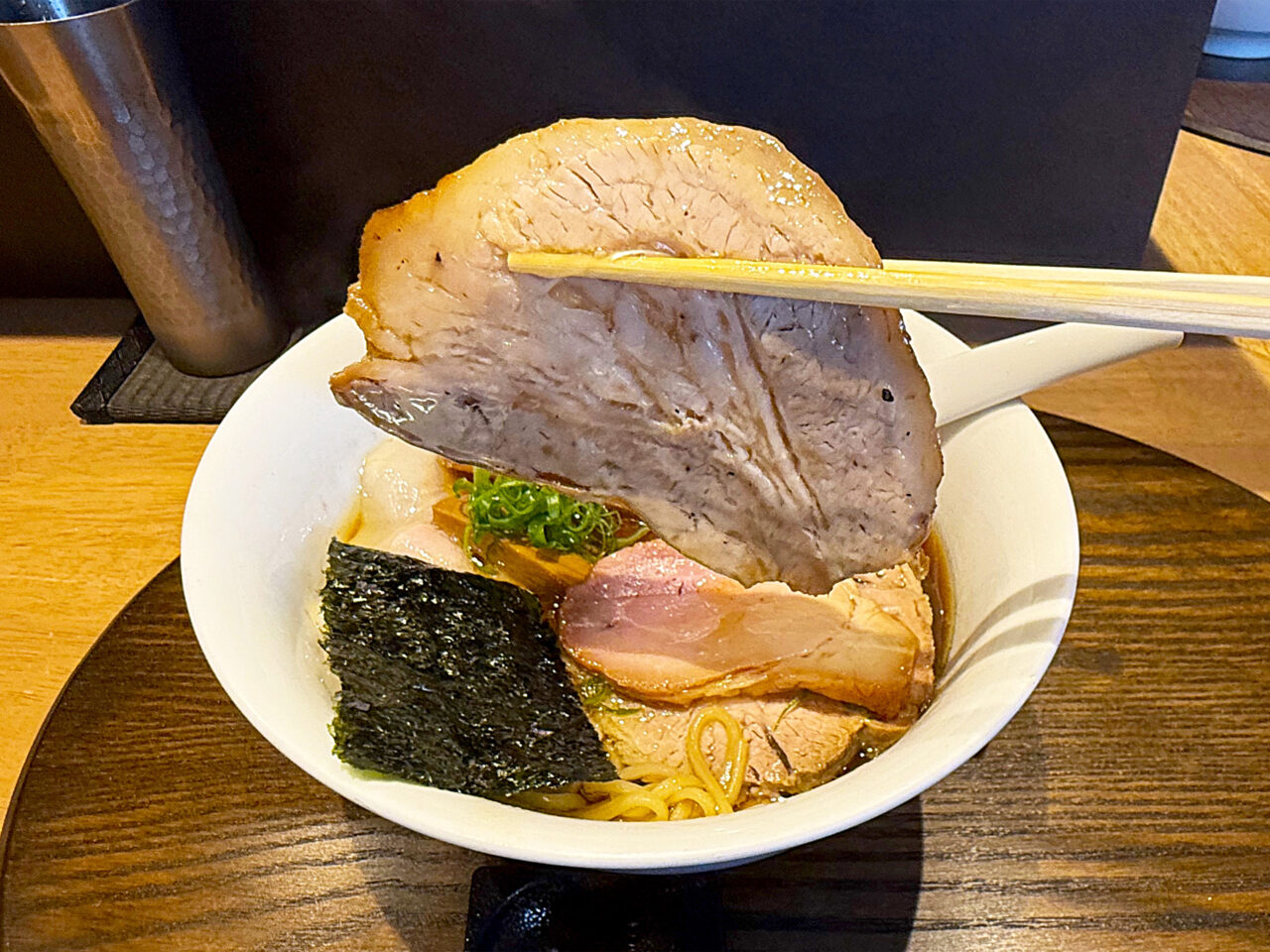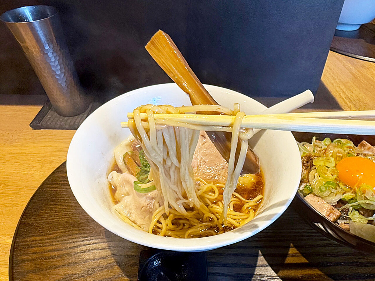 炙ったチャーシューの香ばしい風味と、チャーシュー・卵黄・ネギのコンビネーションが素晴らしいです。