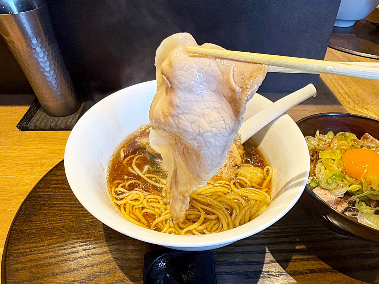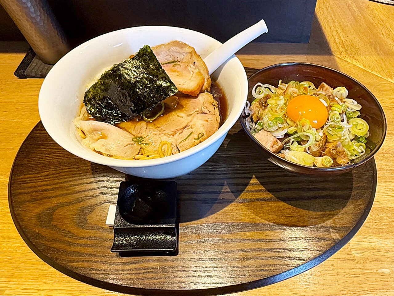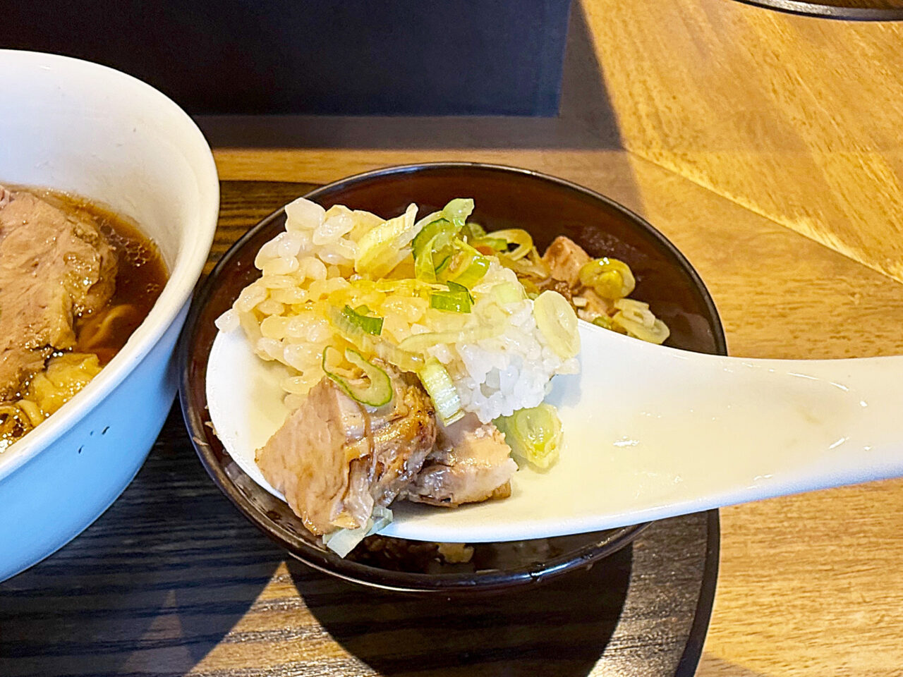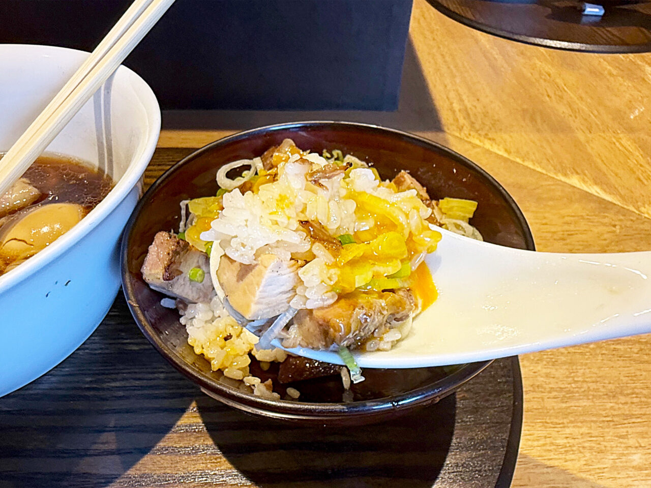 「炙り叉焼ごはん」がまた絶品で、香ばしさと味付けに加え、卵黄のまろやかさとネギの風味が素晴らしいです。