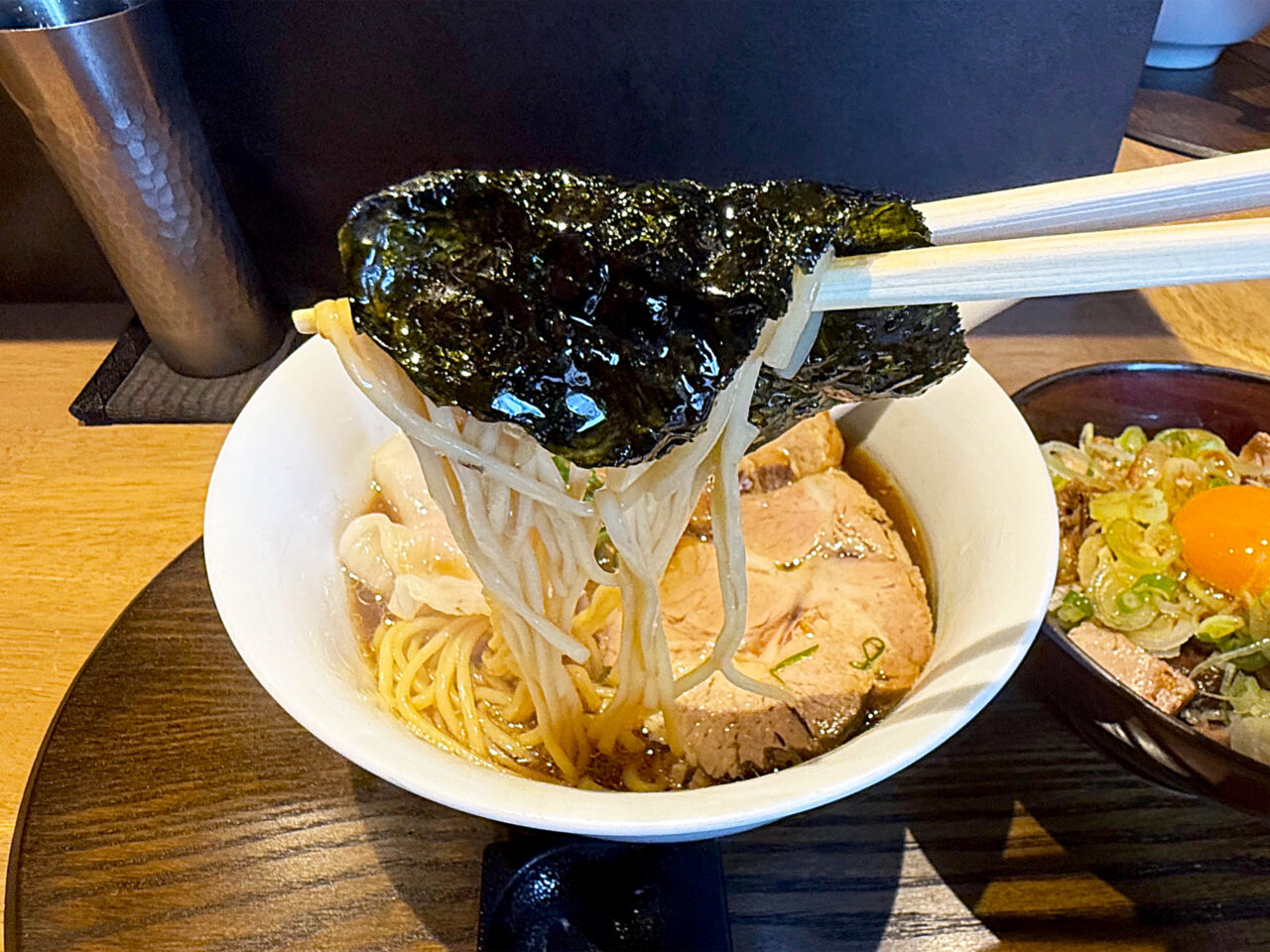 海苔の香ばしさと、醤油味スープの香ばしさが相まって至福の旨さです。