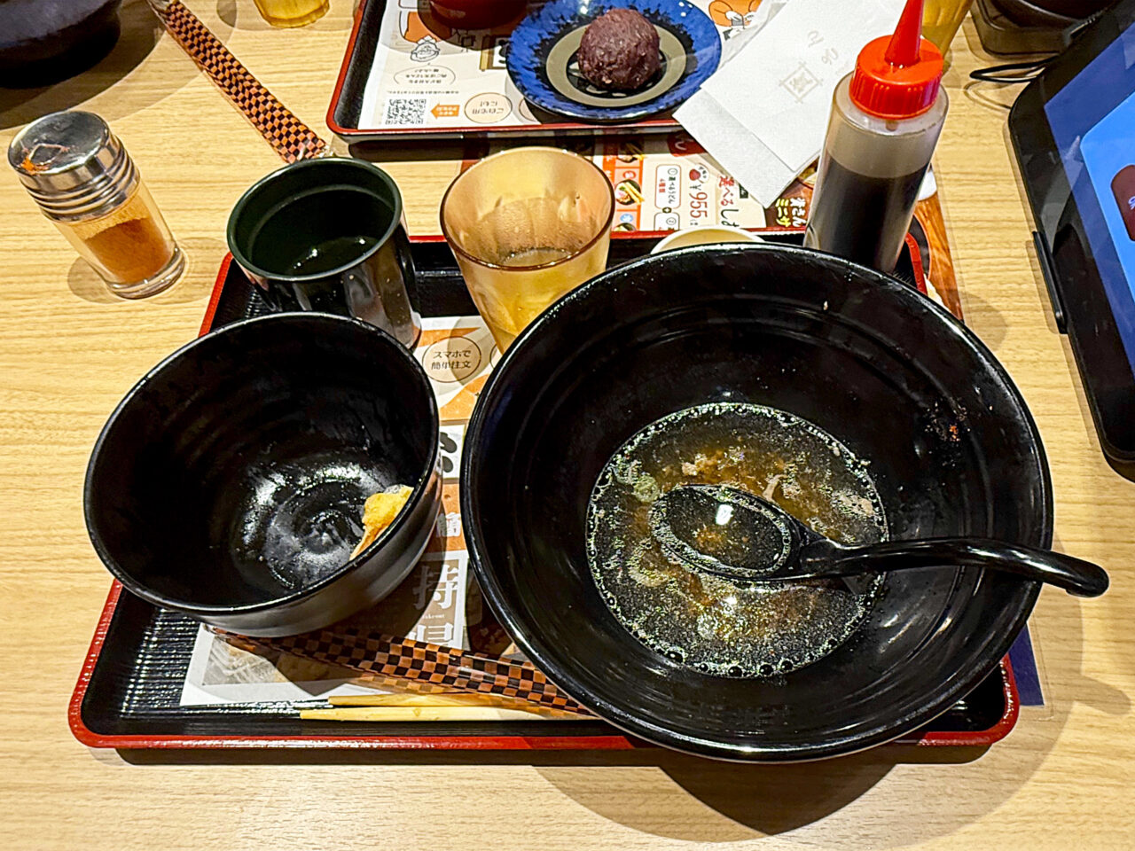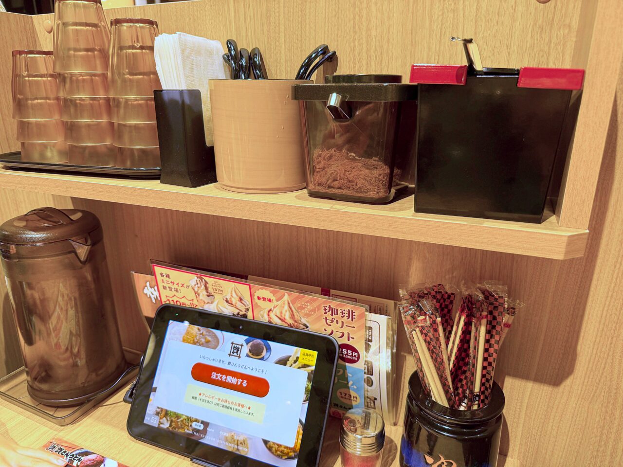 壁際に水の入ったピッチャーやコップ、とろろ昆布、天かすなどが有るのは変わりません。