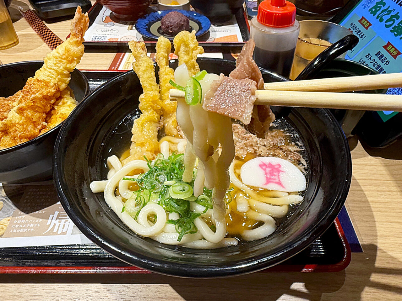 「肉ごぼ天うどん」は、名物の「ごぼ天」と甘めの味付けの牛肉に、鯖と昆布と甘い九州の醤油のお出汁がとても良く合います。