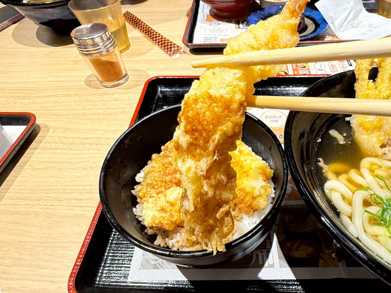 「ミニ大海老天丼」は大海老が大きくて食べ応えがあり、天丼のタレも美味しいです。