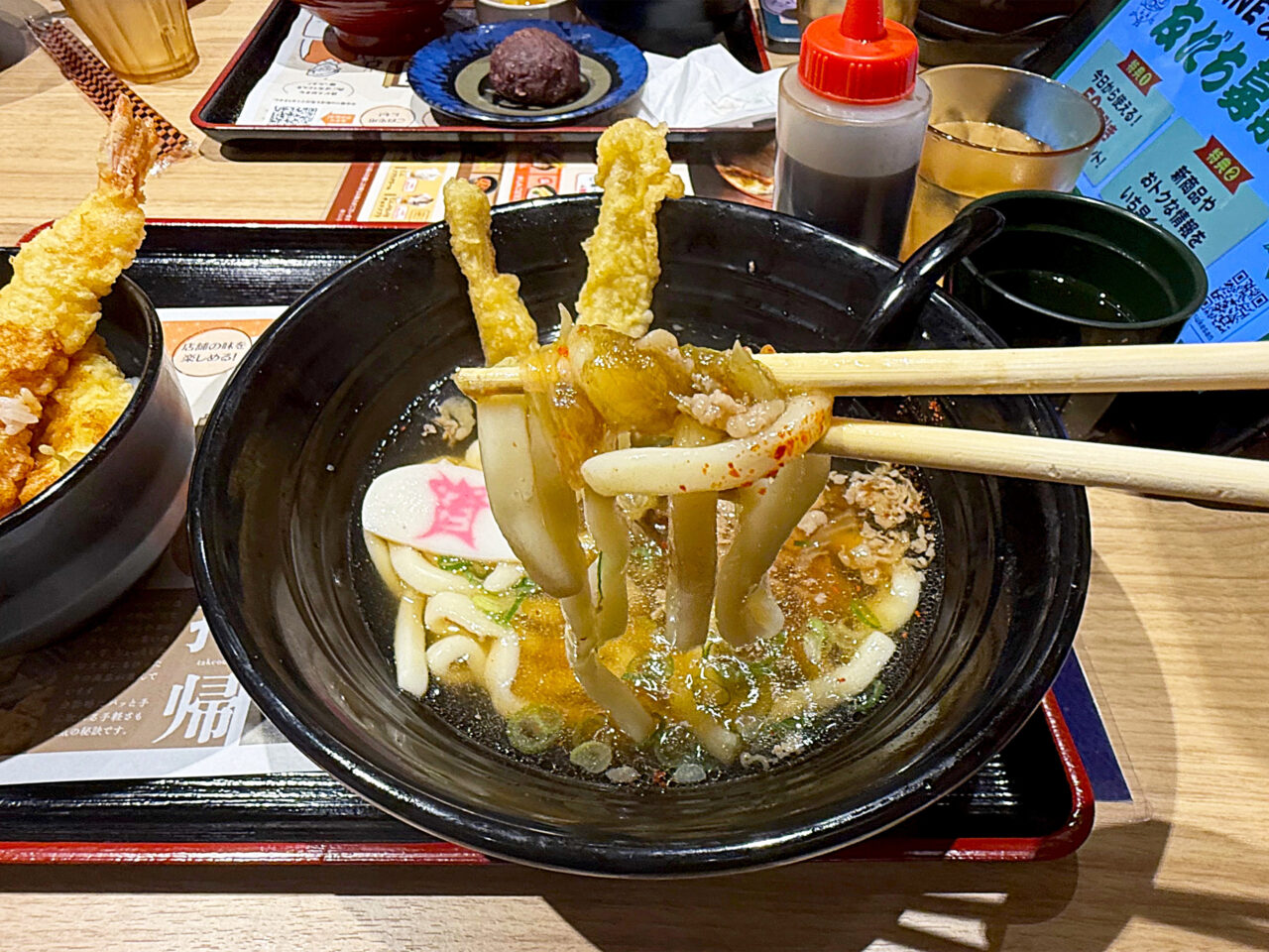 甘めのお出汁は魚介出汁や昆布、椎茸の旨みが有るので、ピリ辛になっても美味しいです。