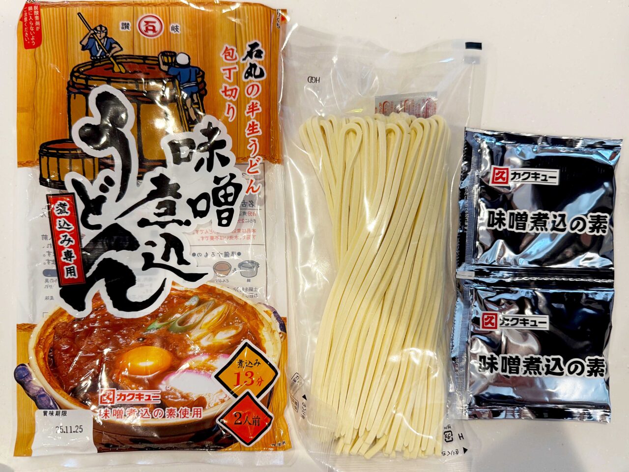 「石丸うどん」の半生うどんと「カクキュー」の「味噌煮込みの素」が同梱されています。