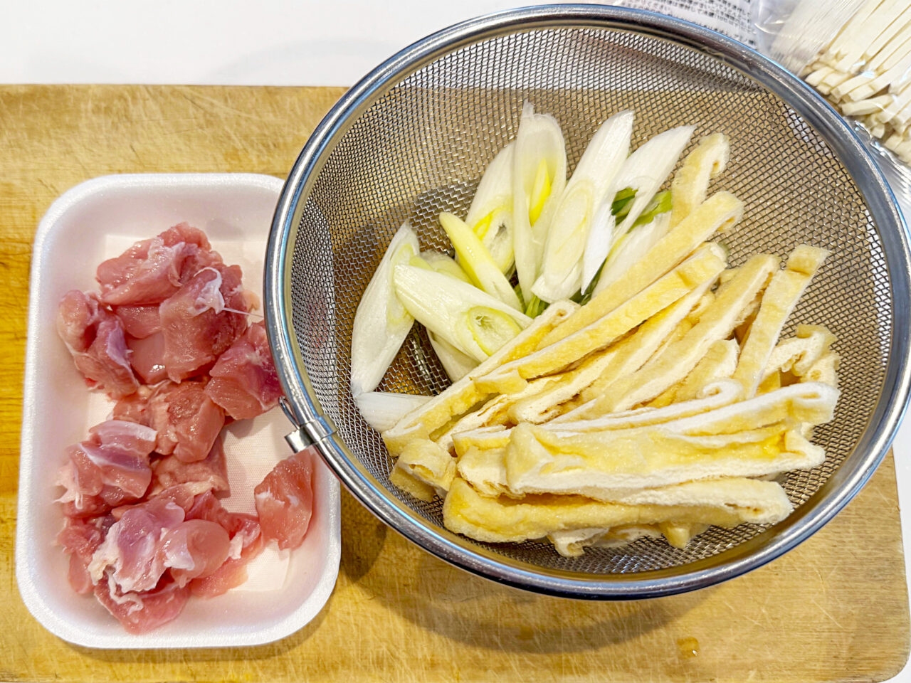 「味噌煮込みうどん」と言えば、鶏肉とネギと揚げのイメージなので、3つを用意しました。