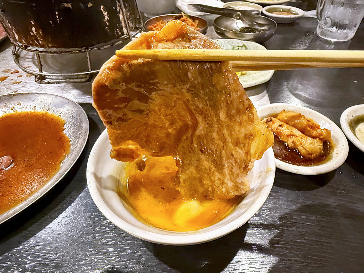 と言う訳で、「味ん味ん 相模大野店」の「牛タン」と「カイノミ」、「ハラミ塩」と「ミノ」と「薄切り和牛のすき焼き風 (生卵付き)」と「黒ホッピーセット」でしたが、とても満足の行く品々でした。