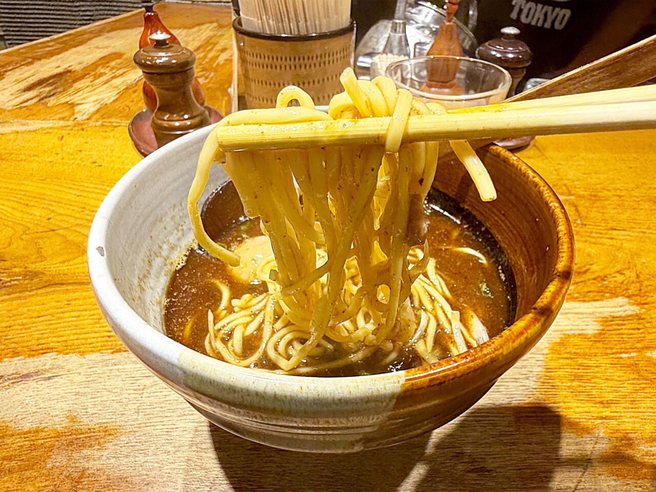 合わせられた中細麺はモッチリ&なめらか食感で、小麦の味も旨くて、スープの絡み方も完璧です。