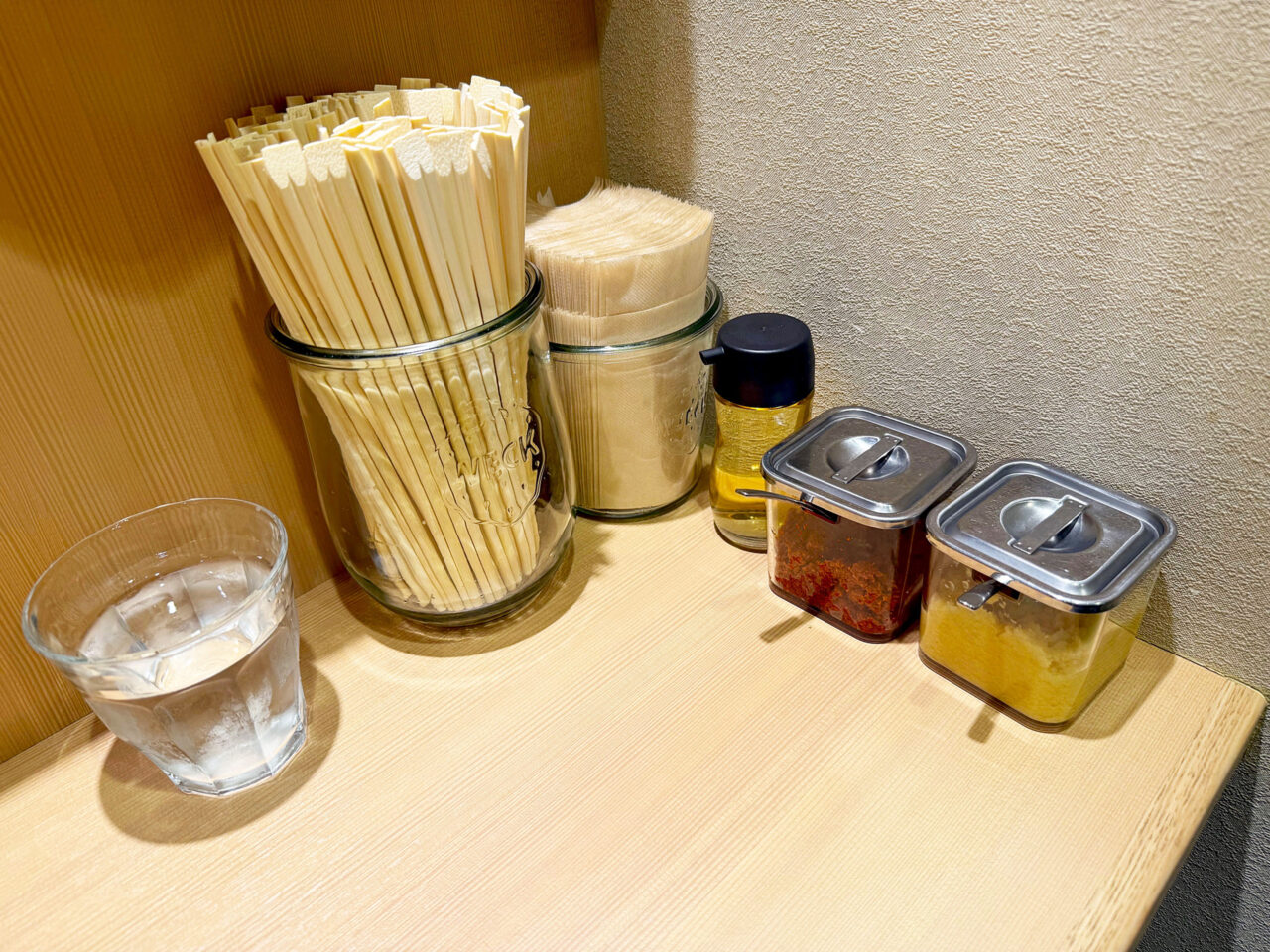 卓上には箸とペーパーナプキン、酢、辛味噌、生姜が有ります。