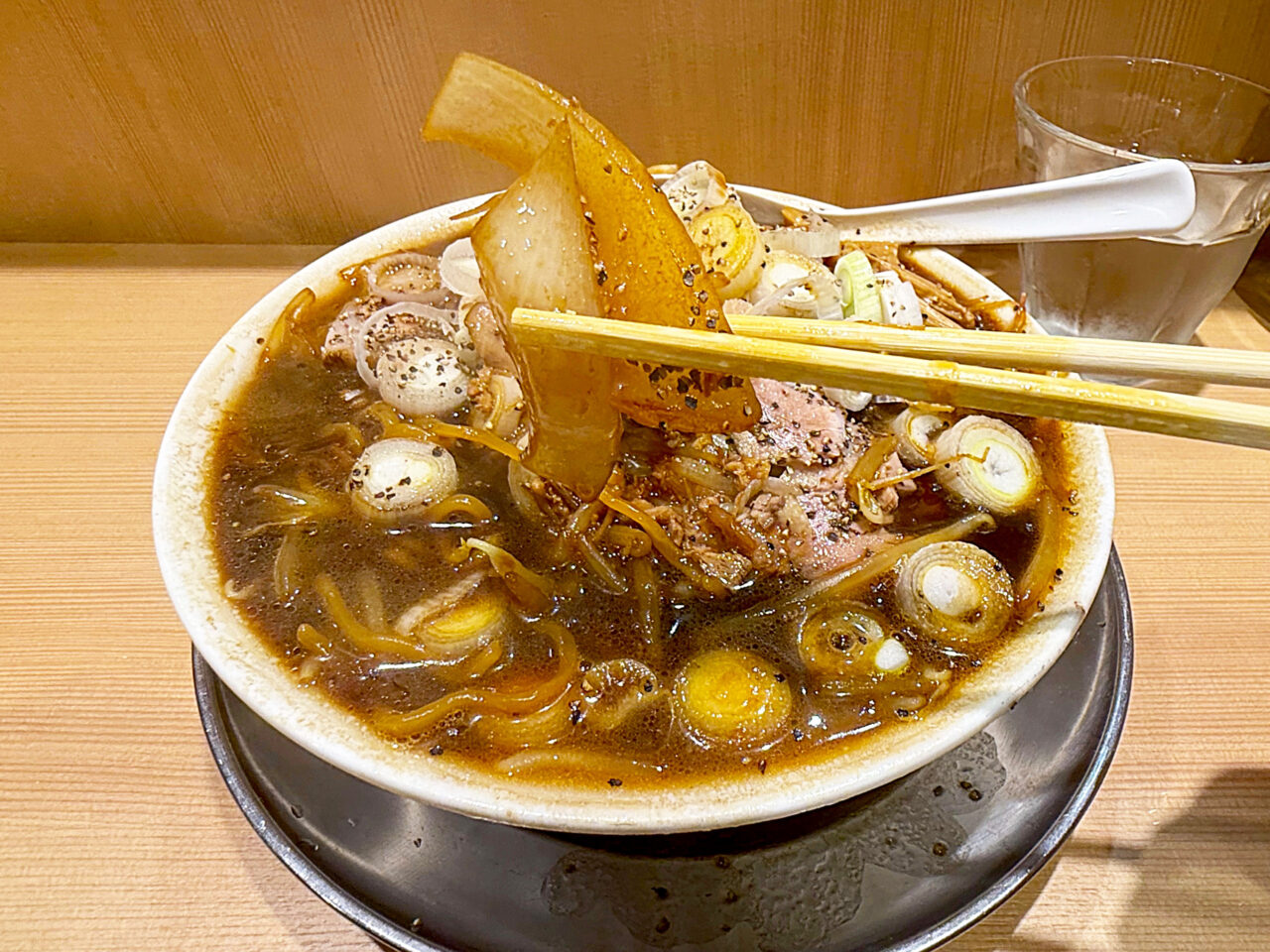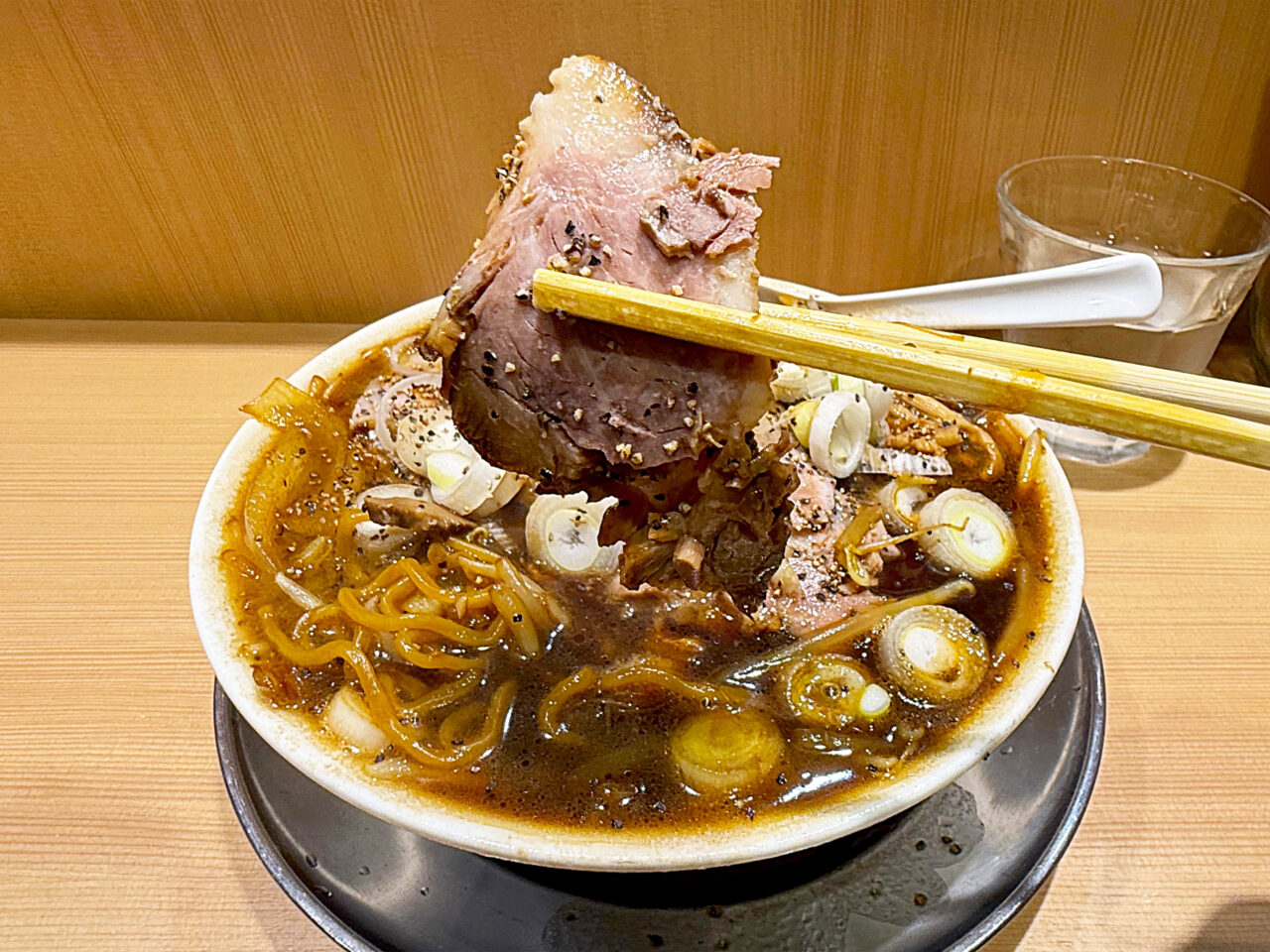 たっぷり掛かったブラックペッパーと醤油の効いたスープに切り落としチャーシューがとても良く合います。