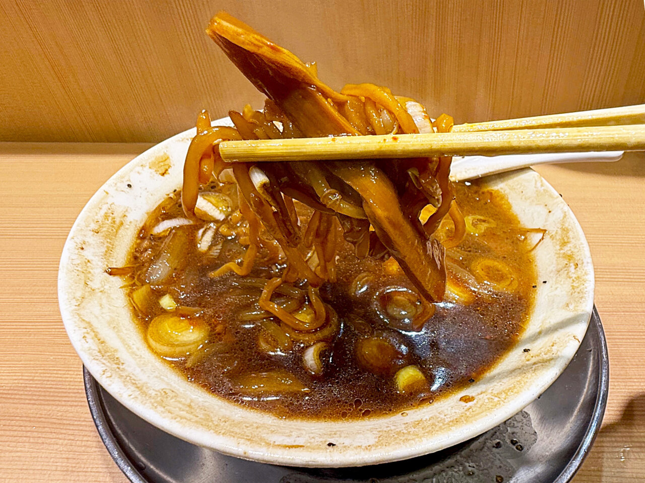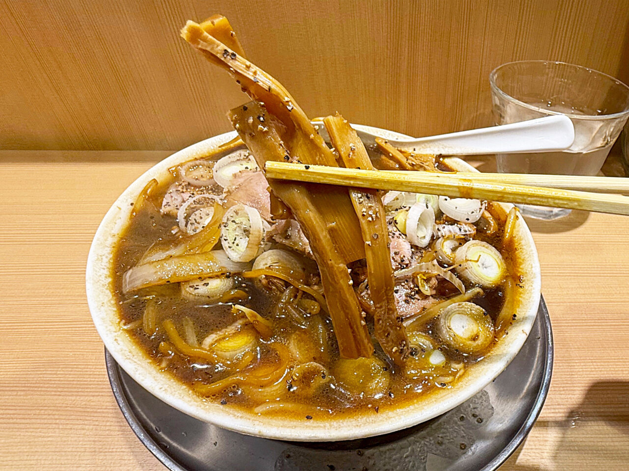 醤油色に染まった麺と、ザクザク食感のメンマが旨いです。