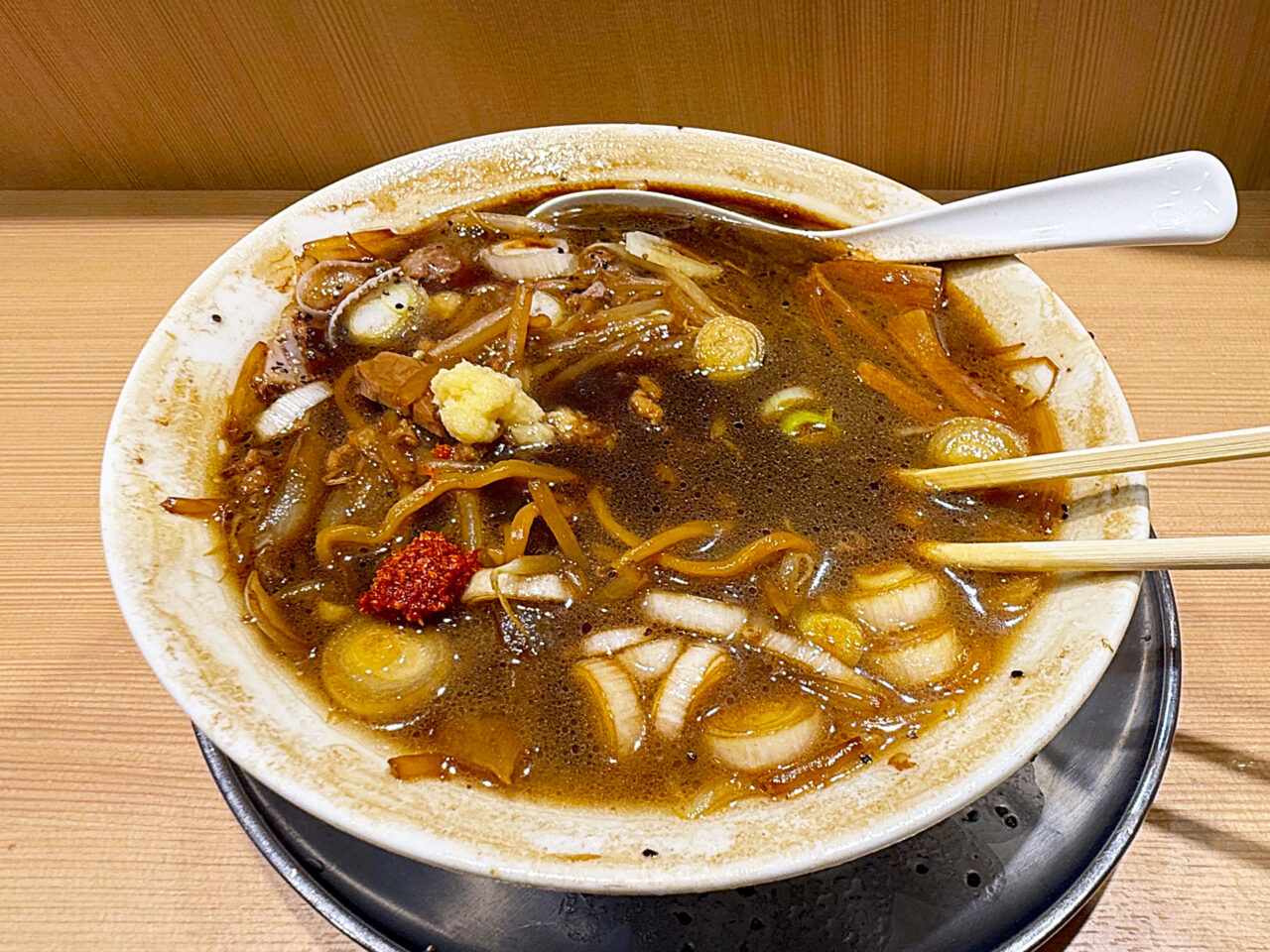 ガツンと醤油の効いたスープとメンマやモヤシ、玉ねぎがとても良く合います。