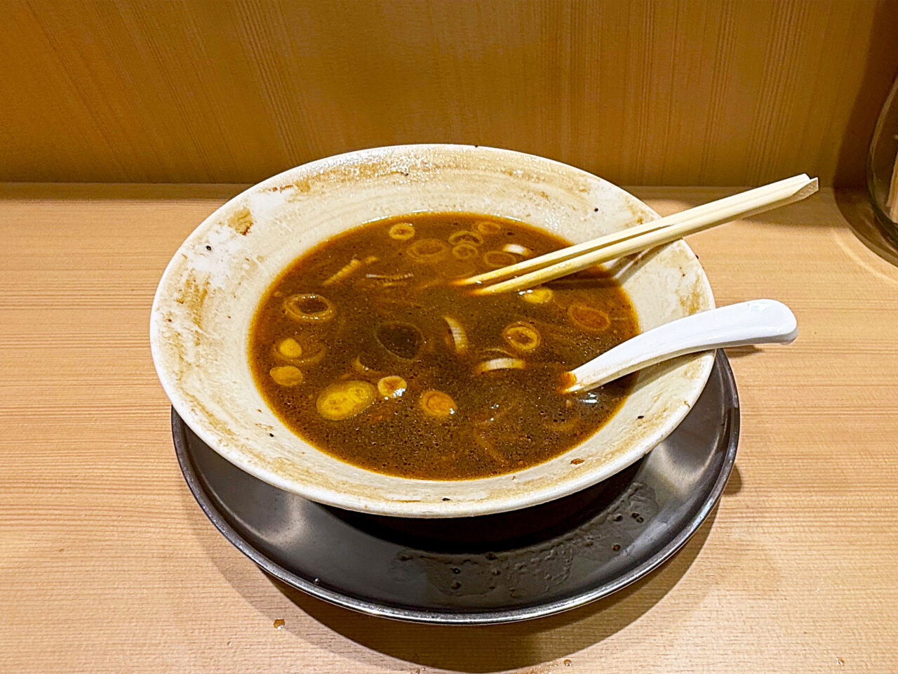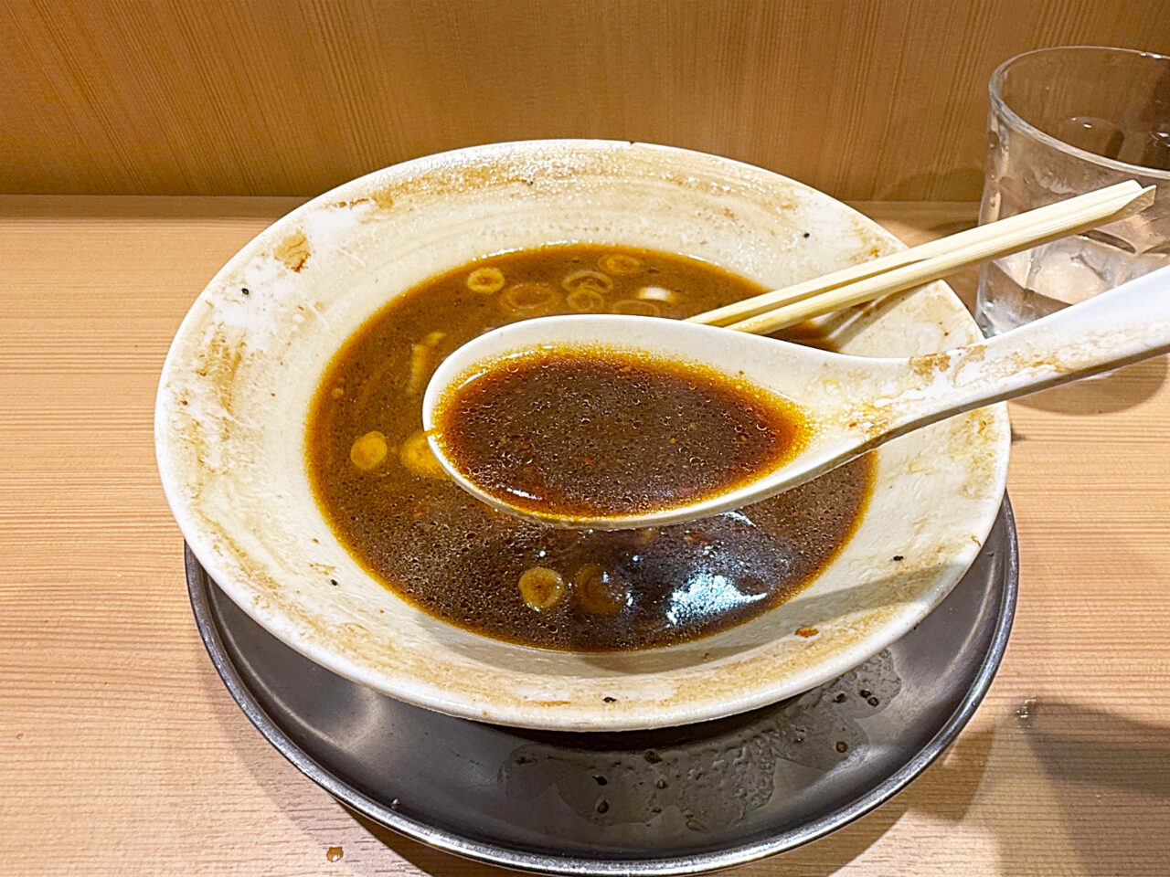 麺と具を食べ終えて、スープをいただきます。