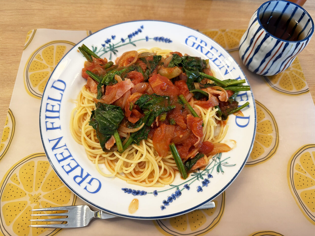 トマト缶で作る、ほうれん草とベーコンのトマトソースパスタ