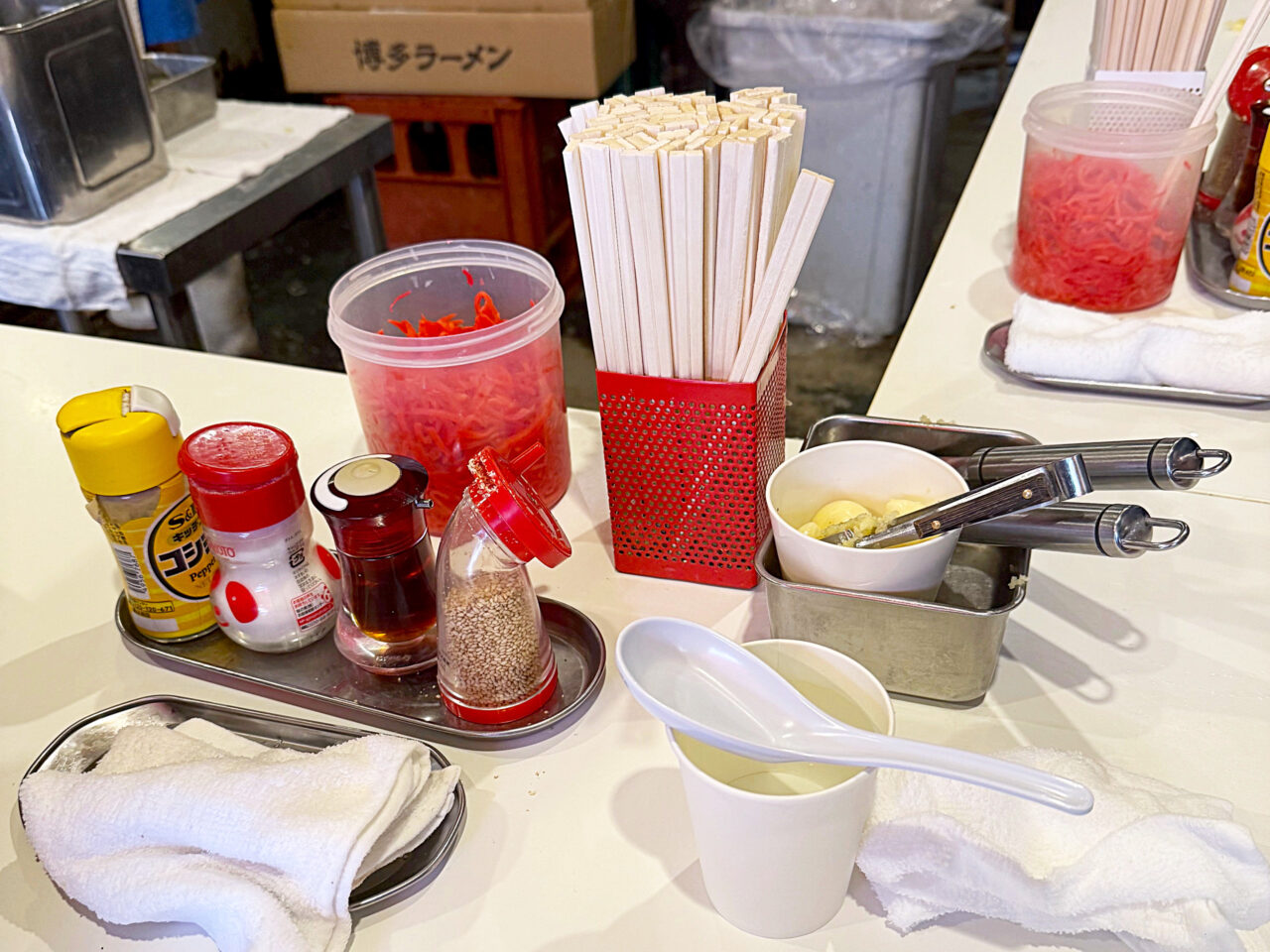 卓上にはコショウ・味の素・ラー油・胡麻、紅生姜、ニンニク、箸、ガーリックプレスが有ります。