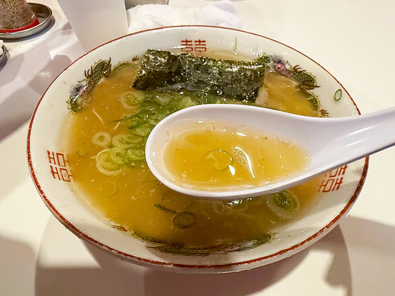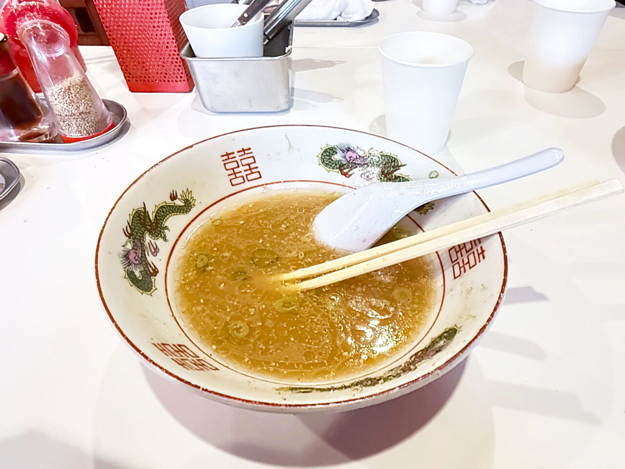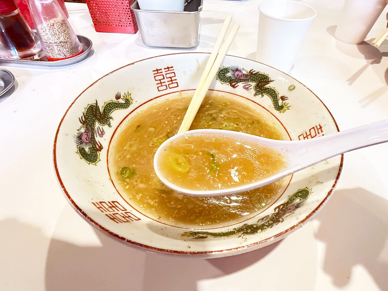 麺と具を食べ終えて、スープを味わいます。