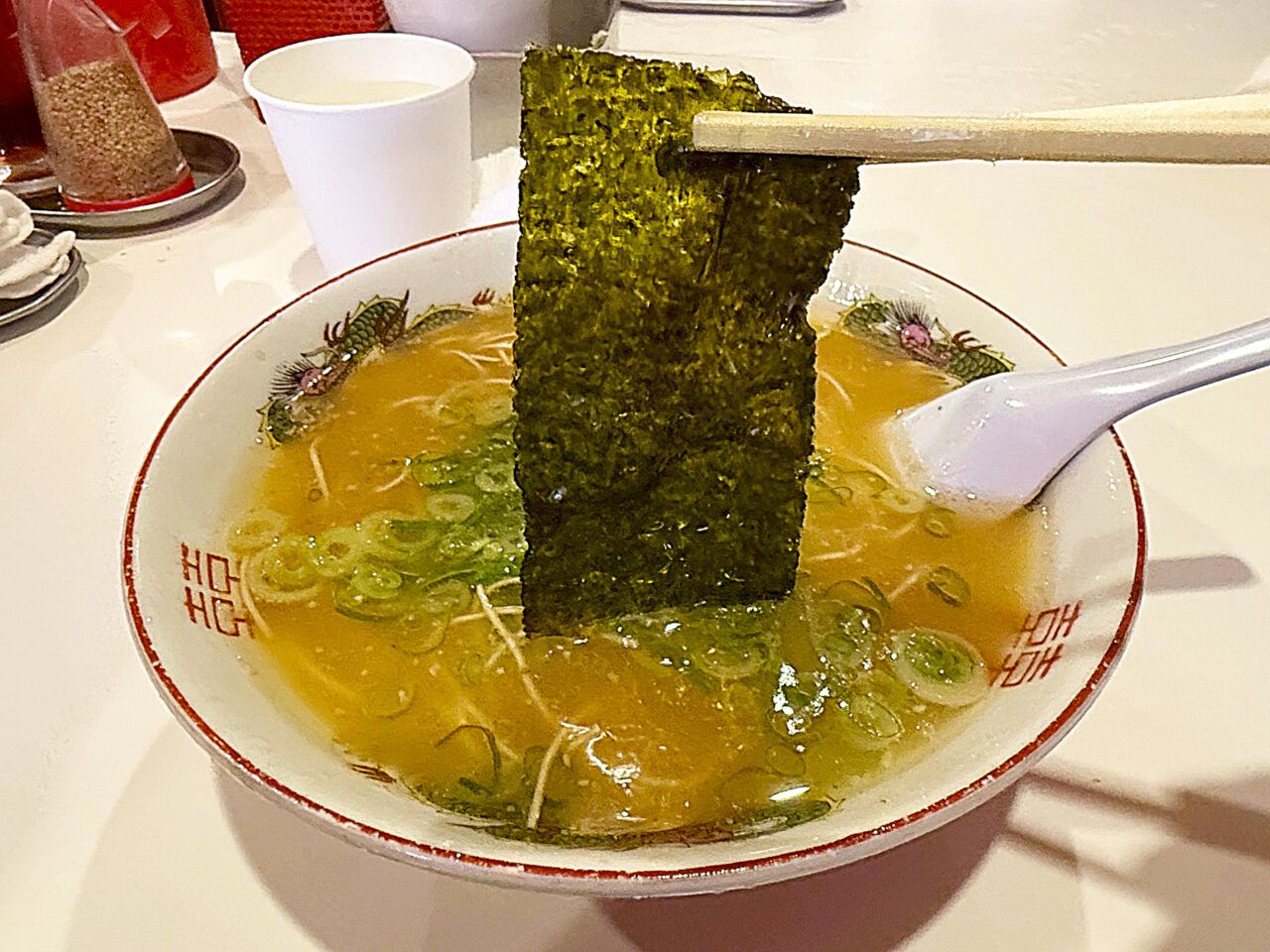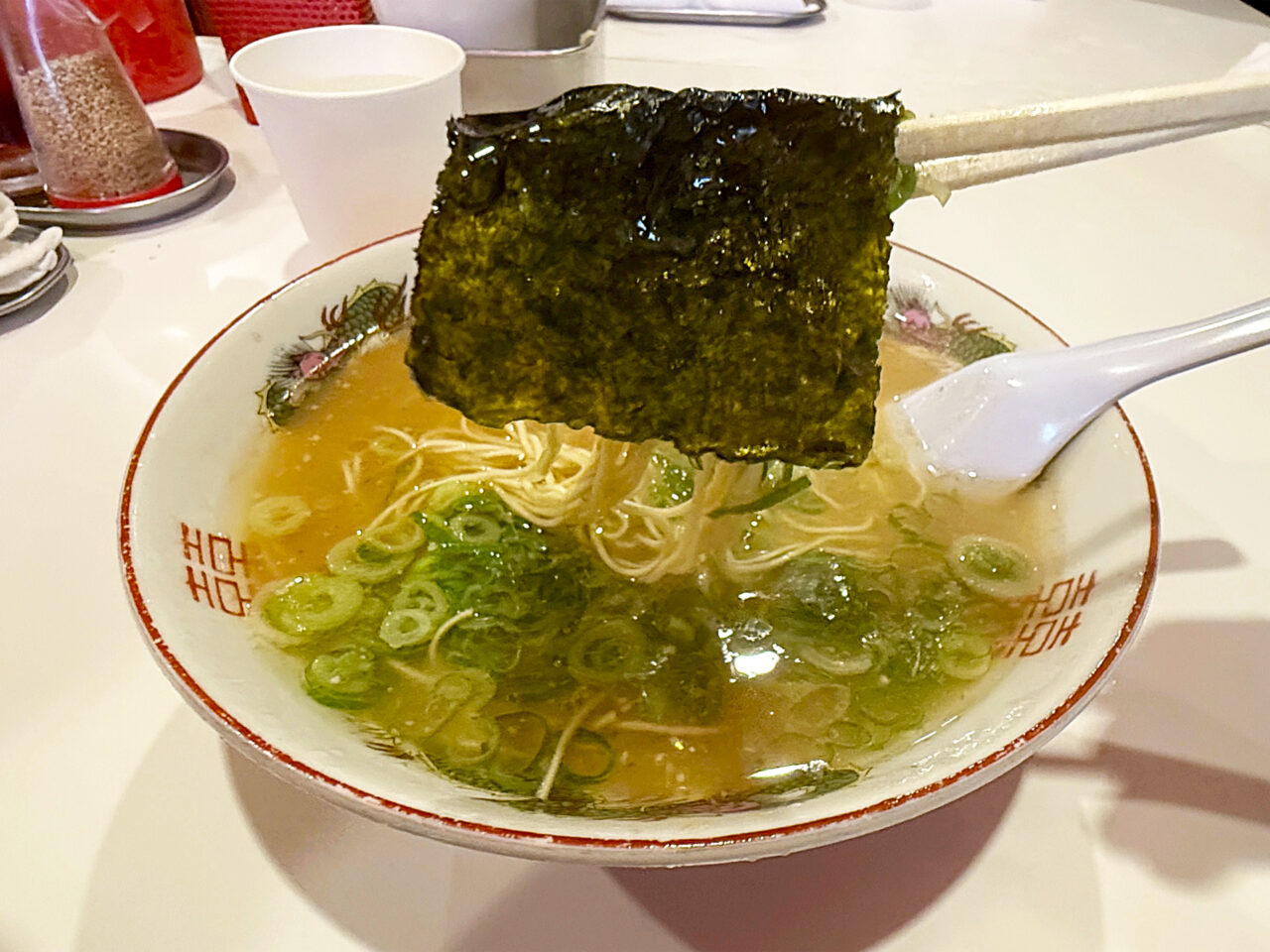 スープに海苔を浸して麺を包んでいただきます。