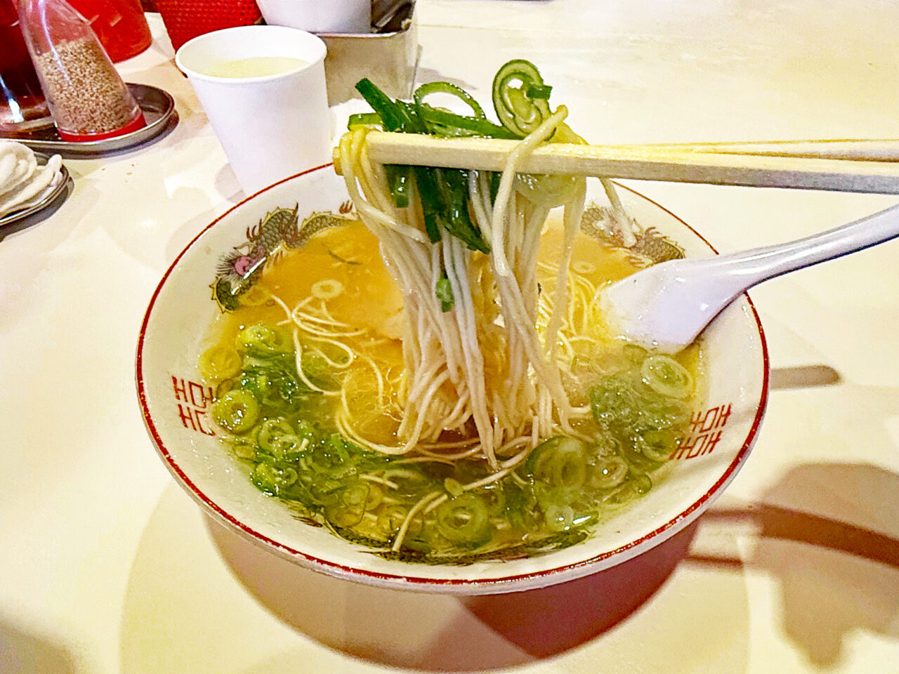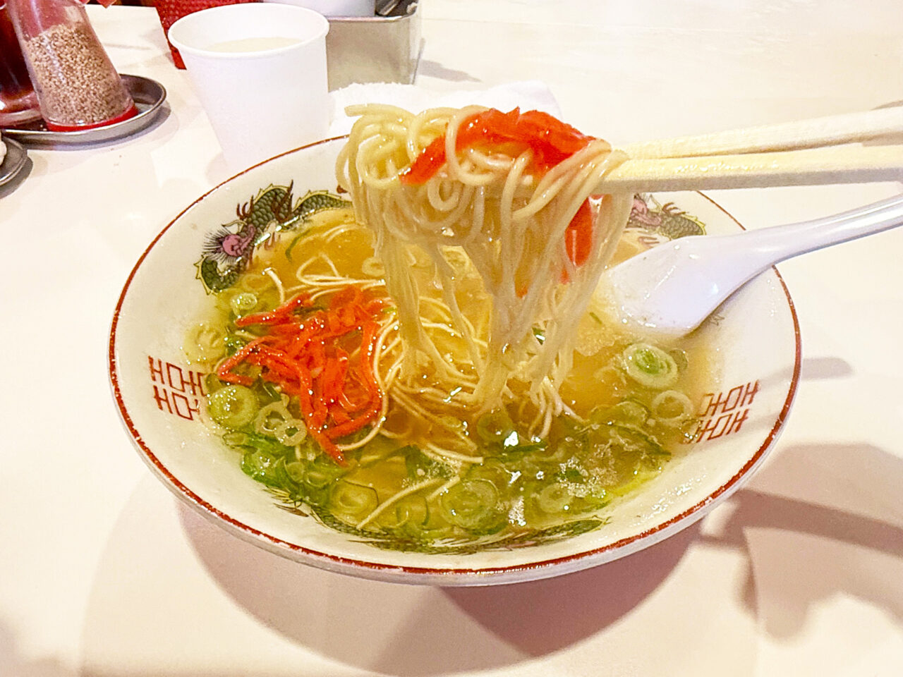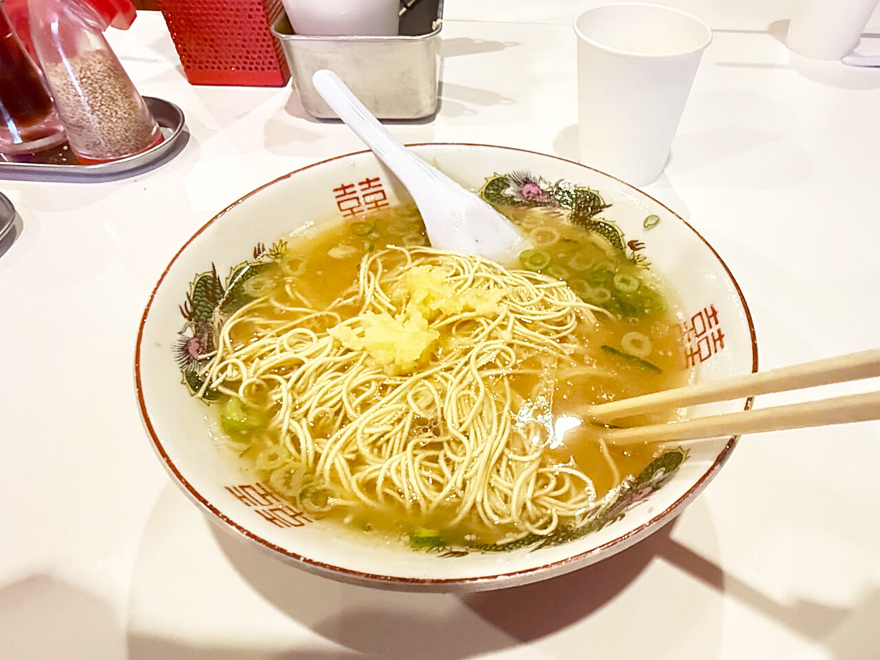 ネギと生姜のそれぞれの風味が、豚骨スープを更に美味しくしてくれます。