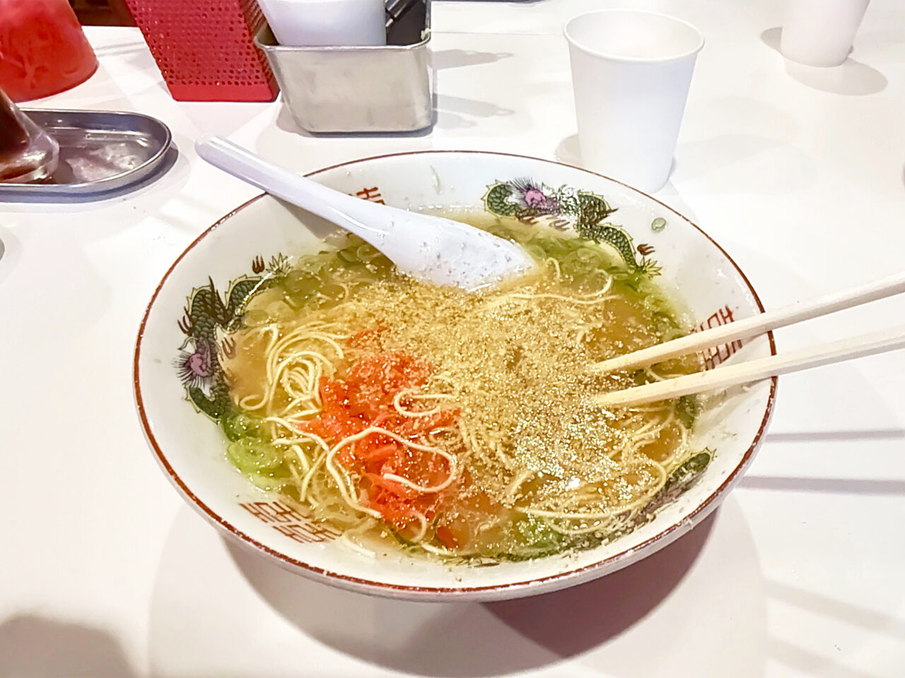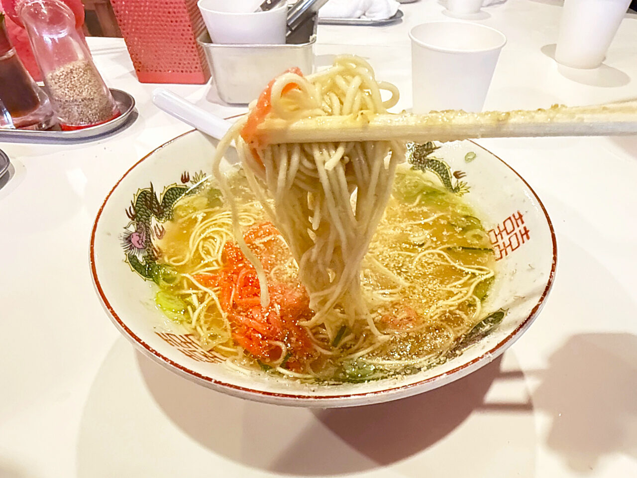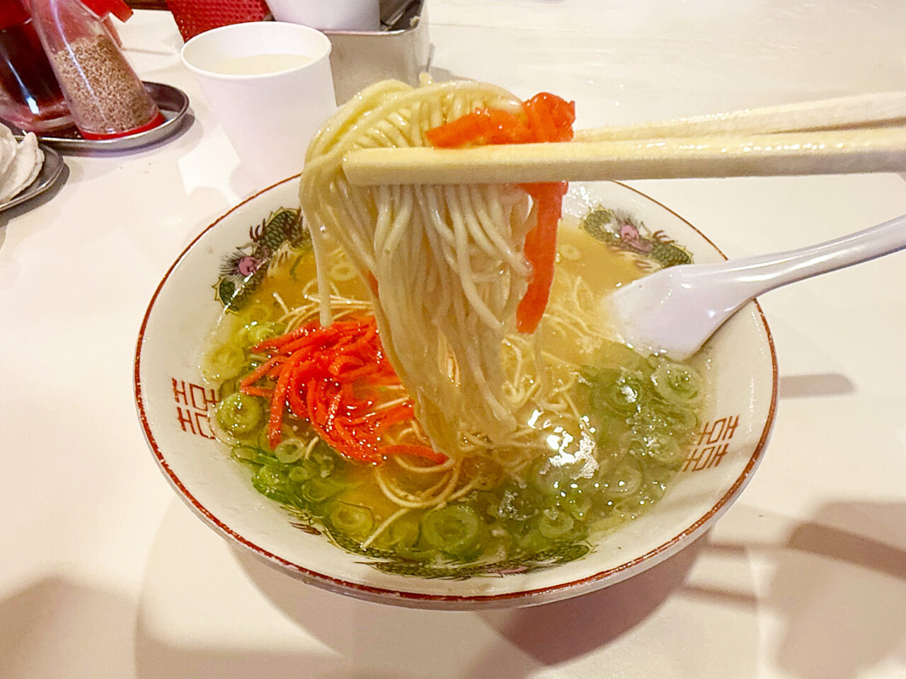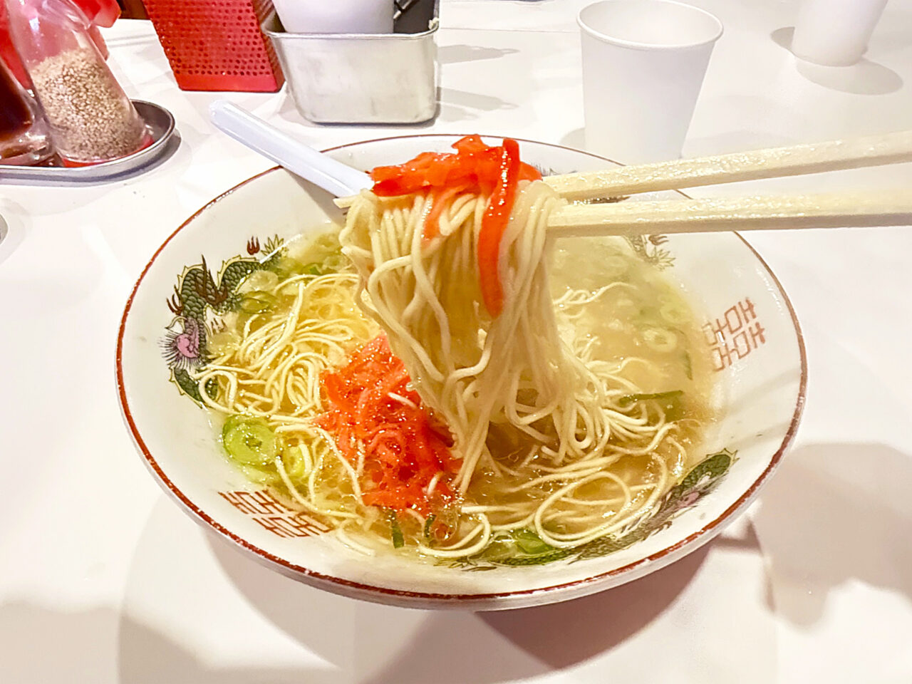 豚骨スープに紅生姜は鉄板の組み合わせです。