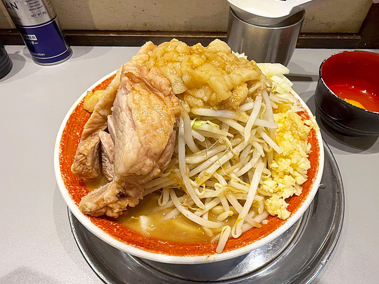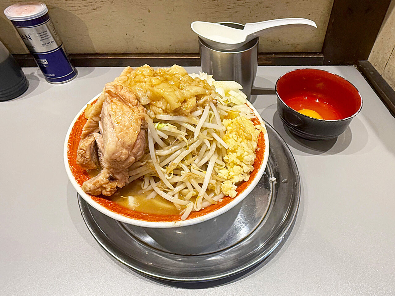 「小ラーメン」+「生卵」をオーダーして、順番にトッピングを聞かれるので、ニンニク・タマネギ・アブラと言ういつものコールでお願いしました。