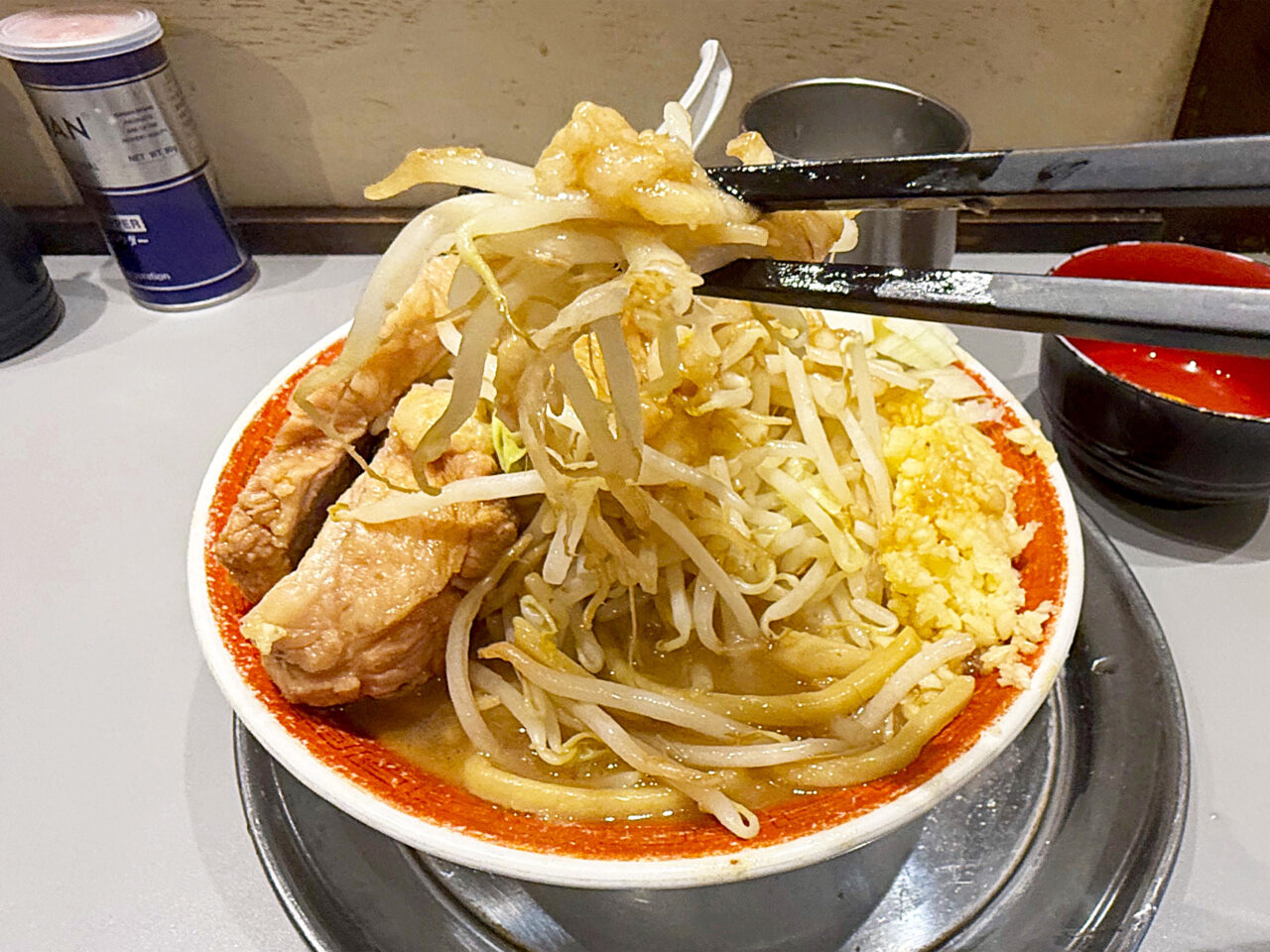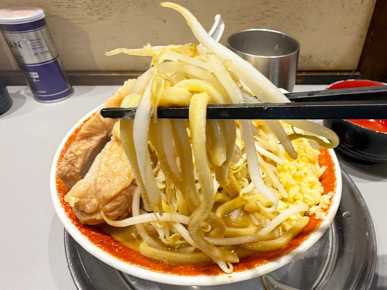 上から見ても豪快なブタの厚み、ヤサイの盛り、アブラの盛りが凄いです(汗)。