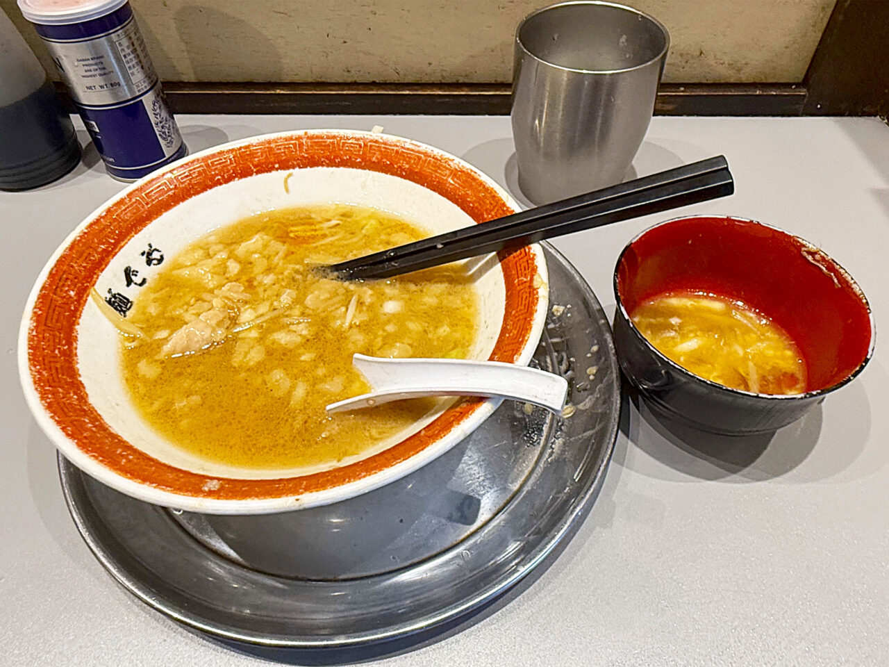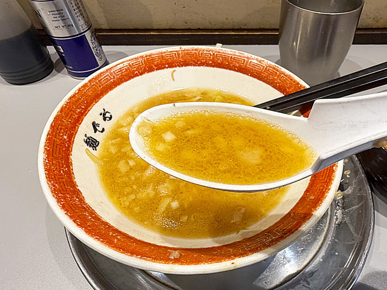 麺と具を食べ終えて、スープを味わいます。